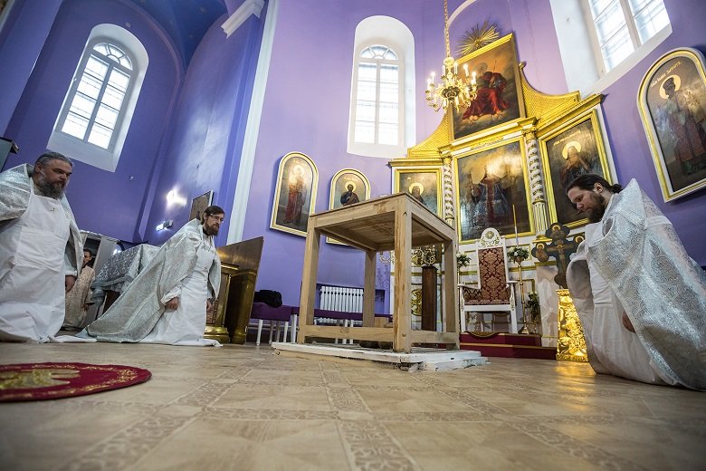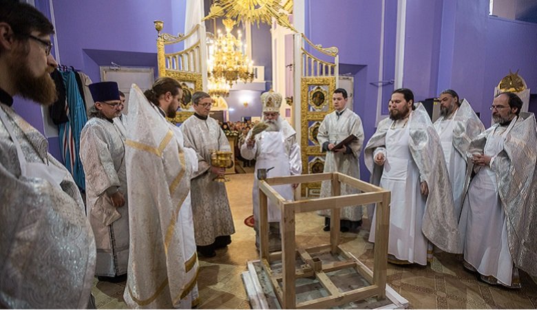 Во время реставрации в Крестовоздвиженском соборе Петрозаводска потребовалось менять покрытие полов, в том числе в алтаре. Работы были основательные, поэтому даже конструкция престола была разобрана — слой за слоем.