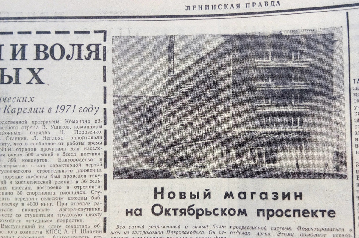 «Это самый современный и самый большой из гастрономов Петрозаводска. Он открылся в пятницу в новом доме на Октябрьском проспекте. Отделы магазина оборудованы новейшими установками отечественного и венгерского производства. Есть и новинки — автоматы для автоматической резки колбасы и масла. Работает магазин по прогрессивной системе самообслуживания населения».