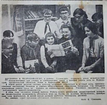 Местная газета писала: «Недавно в Петрозаводске, в районе Сулажгоры, открылась новая межобластная школа – интернат для слепых и слабовидящих детей, в которой учатся дети из Мурманской, Архангельской областей, Коми и Карельской АССР. Ребята живут интересной разносторонней жизнью, обучаются игре на баяне, на духовых инструментах, приобретено семь фортепиано».