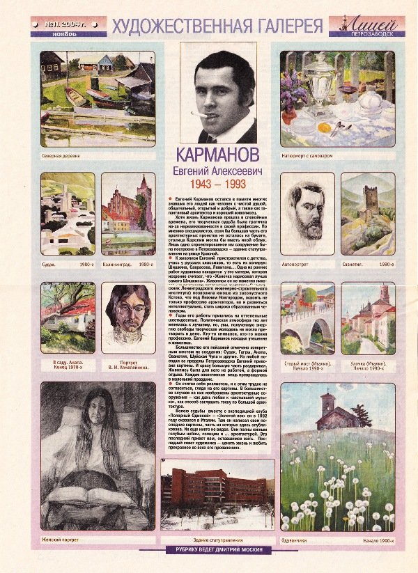 19 декабря 1943 года родился Евгений Алексеевич Карманов (1943-1993), архитектор, художник, Член Союза архитекторов СССР.