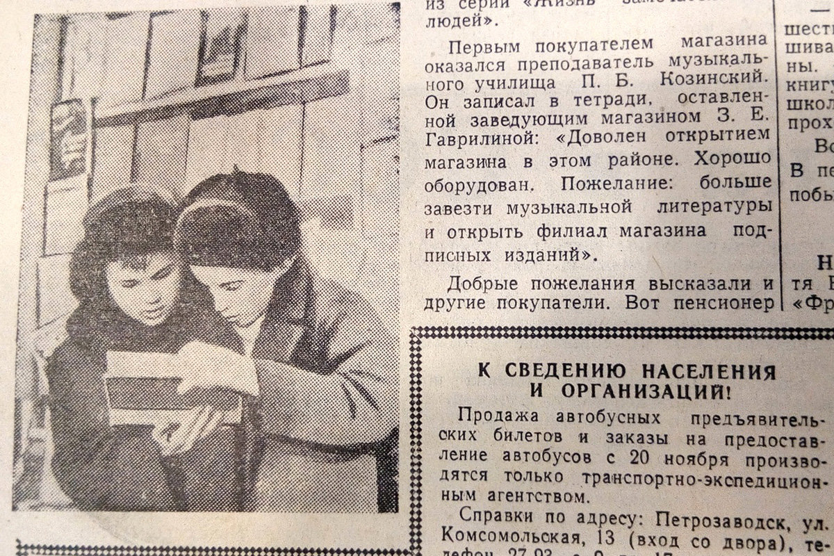 Газета «Ленинское знамя», заметка от 18 декабря: «Улица Мурманская, дом 28. В субботу здесь состоялось открытие нового, девятого по счету в Петрозаводске, книжного магазина. Помещение не велико, в нем светло и уютно. К полкам с книгами свободный доступ. Вот, например, объемистый сборник «Смех — дело серьезное». Рядом — новое издание романа Г. Николаевой «Битва в пути». Среди новинок — «Война за океан» Н. Задорнова, «Цветы на танках» Фабиана Гарина, «Город Ильеус» Жоржи Амаду».