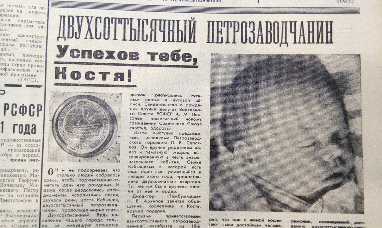 Торжественной была эта церемония. К Дому бракосочетания на машине, сопровождаемой эскортом мотоциклистов, подъехали Кабышевы. Их встретили цветами и хлебом-солью. Свидетельство о рождении вручил депутат Верховного совета А. М. Певгонен. Председатель исполкома горсовета П. В. Сепсяков вручил родителям наказ и памятную медаль. Семье Кабышевых предоставлена двухкомнатная квартира. Песнями приветствовали 200 тысячного петрозаводчанина октябрята из 10 средней школы и народная хоровая группа Дома культуры онежцев. Родители заверили, что воспитают сына достойным человеком и патриотом Родины».