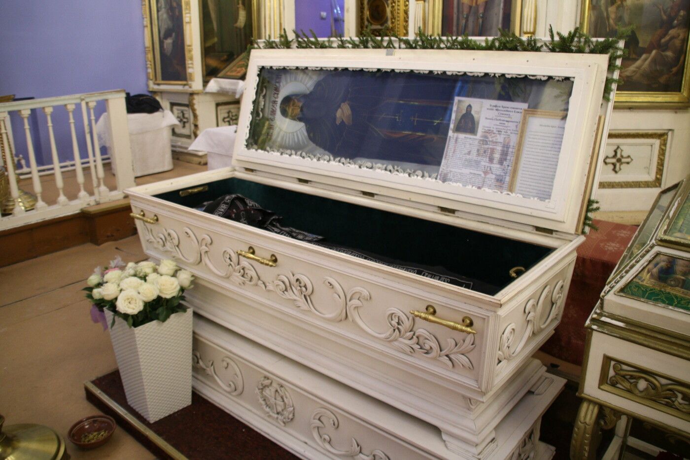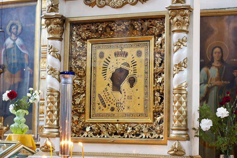 Престолы храма: в честь Животворящего Креста Господня, Вознесения Господня, прп. Антония Римлянина. Главные святыни храма: иконы Божией Матери «Скоропослушница», «Тихвинская», «Казанская», «Троеручица»; иконы прп. Антония Римлянина, вмц. Варвары, вмц. Екатерины, свт. Иоасафа Белгородского с частицей мощей; мощи прп. Елисея Сумского, Соловецкого чудотворца.
