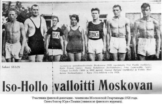 Фото: Участники финской делегации — чемпионы Московской олимпиады 1928 года. Слева боксер Юрье Паакки (снимок из финского журнала). Команда финских футболистов, борцов, бегунов, гимнастов и боксёров на Всесоюзной спартакиаде