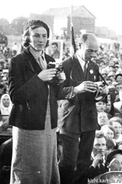 Фото: Фотографы З.М.Иванова и Я.М.Роскин на митинге, посвященном приезду И.Д.Папанина, Кондопога, 1938. Фотографы И.А. Котов и З.М. Иванова