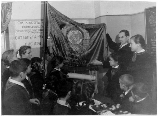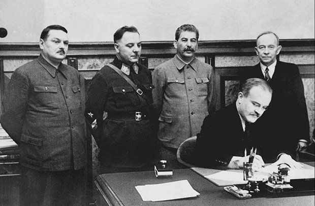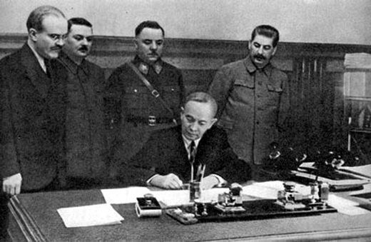 Фото: В. М. Молотов подписывает договор между СССР и Терийокским правительством. Стоят: А. А. Жданов, К. Е. Ворошилов, И. В. Сталин, О. В. Куусинен.