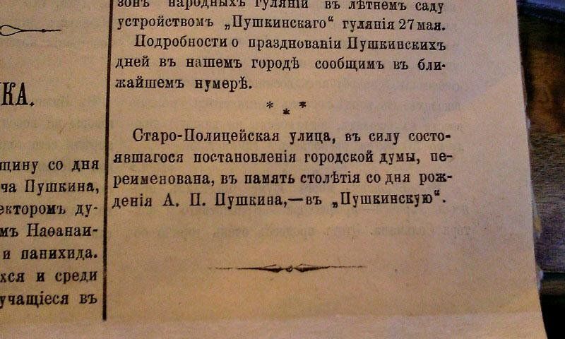 29 марта 1899 года решением Петрозаводской городской думы Старополицейская улица в Петрозаводске была переименована в Пушкинскую в честь 100-летия со дня рождения А.С.Пушкина.