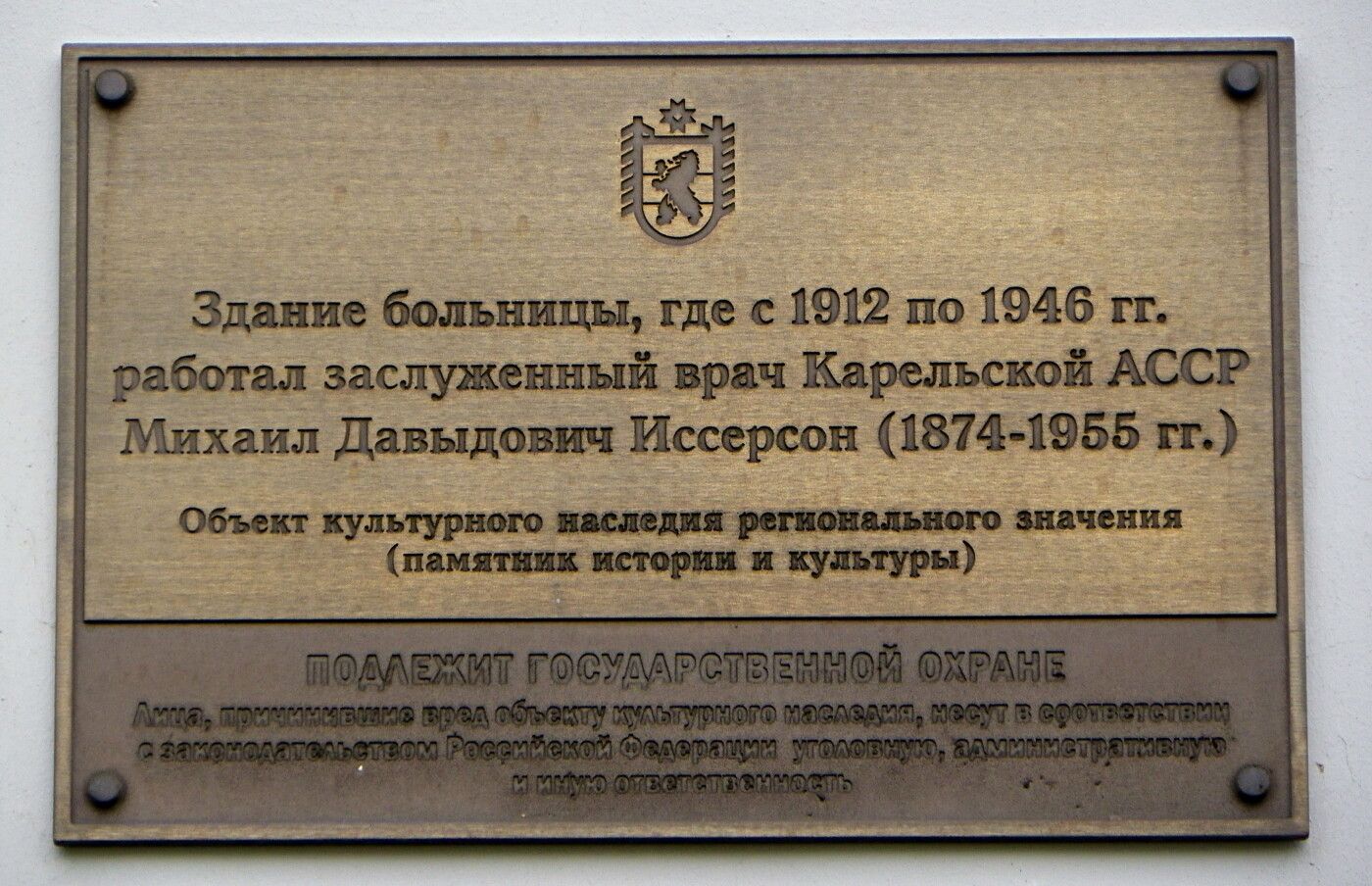 С 1908 года его судьба неразрывно связана с здравоохранением Карелии. По прибытии в Петрозаводск Михаил Давыдович был назначен заведующим хирургическим отделением Олонецкой губернской больницы. При его активном участии в 1912 году было построено отдельное здание хирургического отделения. А в 1933 на его базе возникает прекрасно оборудованная хирургическая больница. В ней впервые в республике был установлен рентгеновский аппарат, организована лаборатория, был введен физиотерапевтический метод как обязательное дополнение к хирургии, вводилась рентгенотерапия. При хирургической больнице М.Д. Иссерсон организовал филиал Центрального института переливания крови, впоследствии реорганизованный в Карельскую станцию переливания крови.