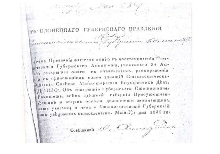 6 мая1835 года в Петрозаводске состоялось открытие Олонецкого губернского статистического комитета (ныне – Территориальный орган Федеральной службы государственной статистики по Республике Карелия «Карелиястат»).