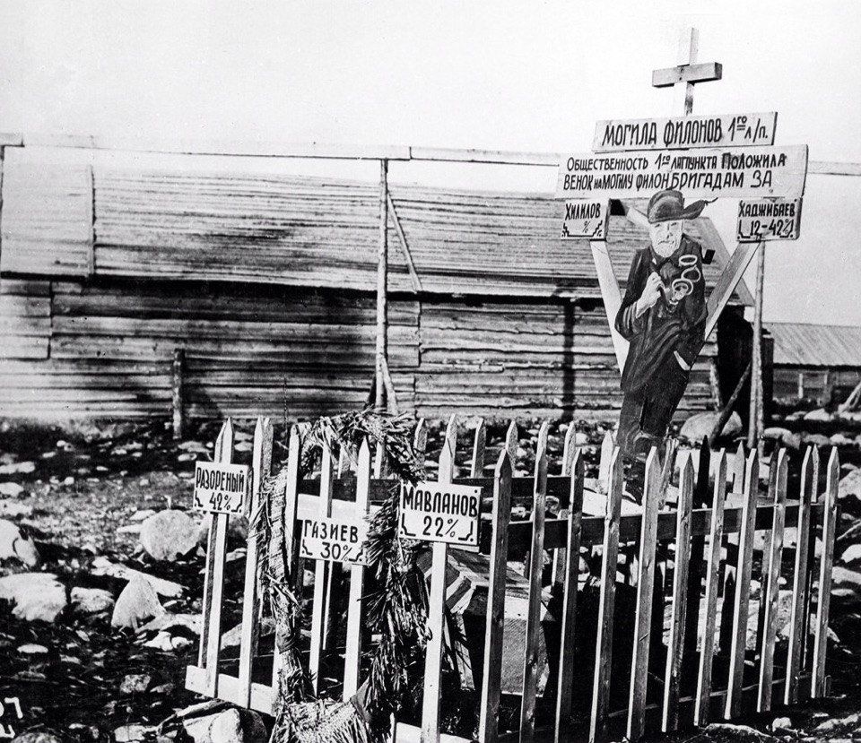 Фото: Могила филонов. Пропагандистская инсталляция в исправительно-трудовом лагере, — на дощечках написаны проценты выработки и фамилии «филонов» из числа заключенных. 1-й лагпункт, Беломоро-Балтийский канал, 1932 год.