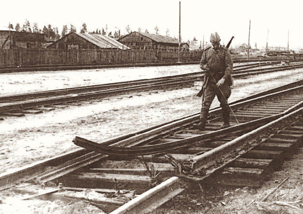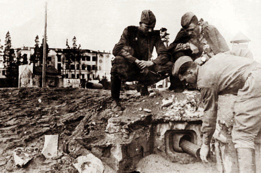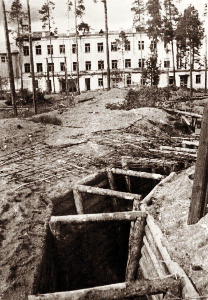 Фото: Советские солдаты ведут бой за освобождение Медвежьегорска. Разминирование на станции Медвежья Гора. Траншеи на территории санатория, после освобождения города. Июль 1944 года