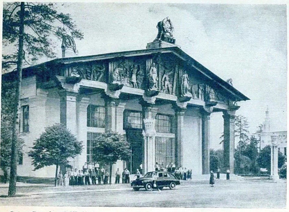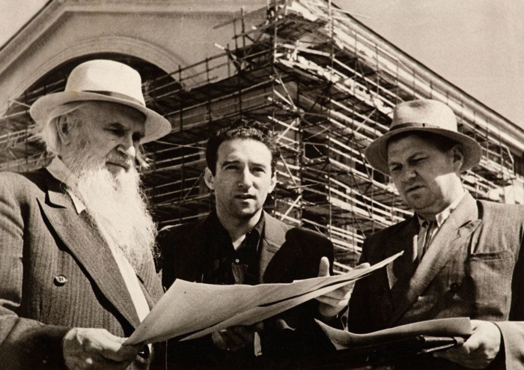 Фото: С.Т. Коненков, архитектор С.Г. Бродский, директор театра С.П. Звездин на фоне строящегося здания Музыкального театра. 1954 год