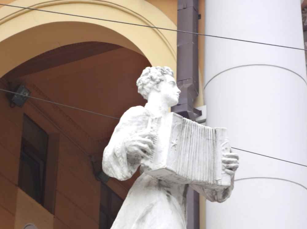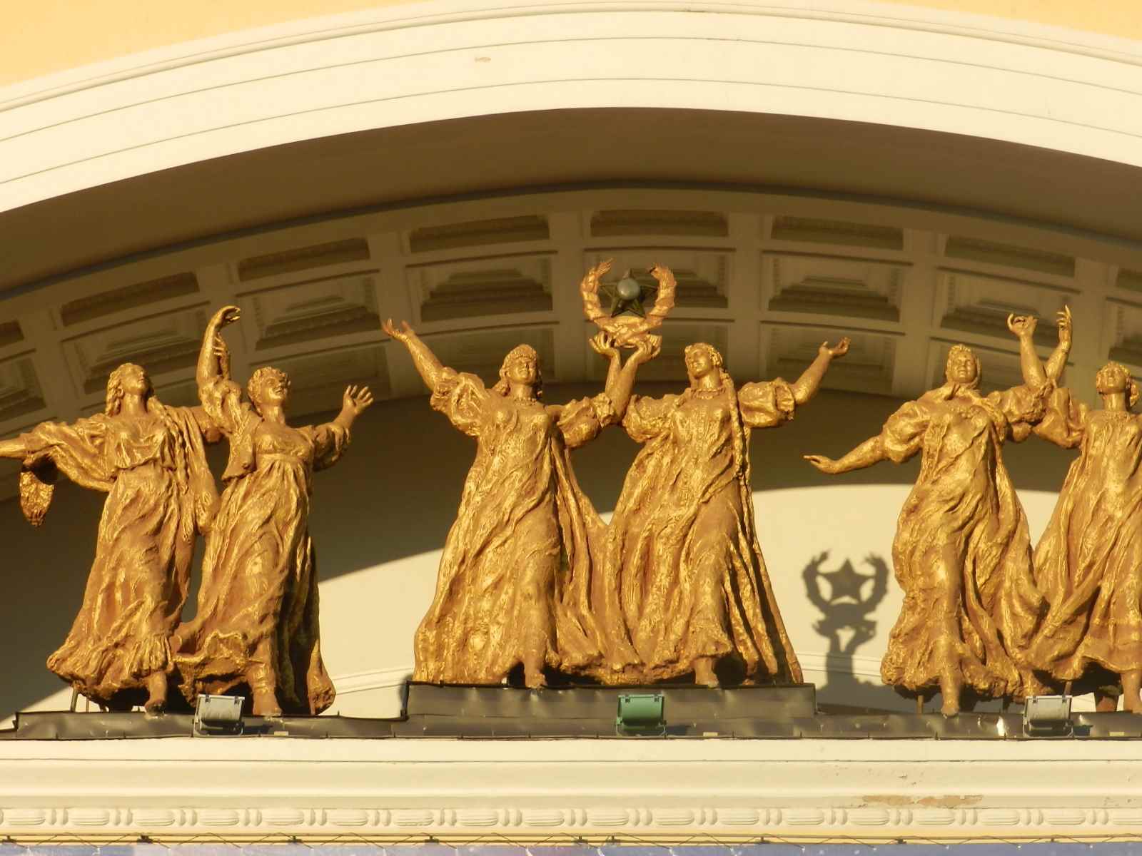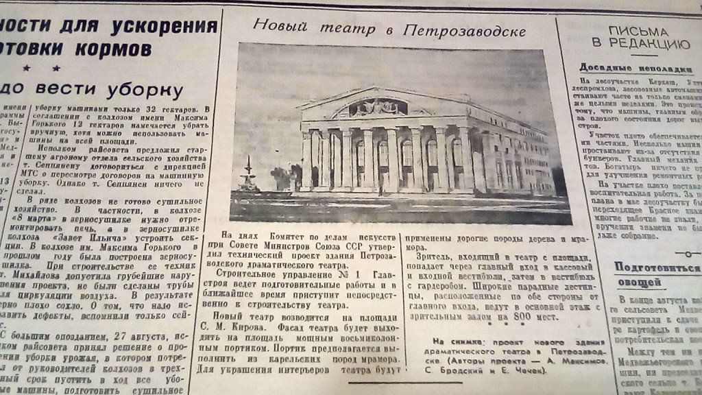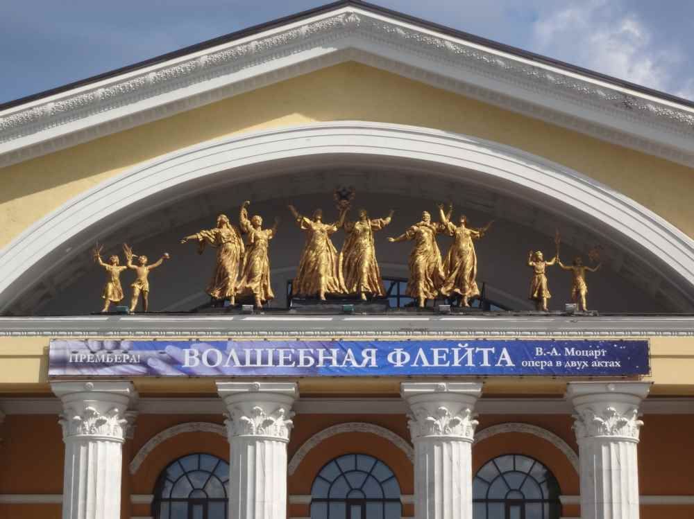 Благодаря скульптурам Коненкова наш театр поднялся на художественную высоту. Из воспоминаний Сергея Коненкова: «Я всегда мечтал создать грандиозные фигуры, которые стоят не под крышей, а под открытым небом и всем видны издалека. Эту свою мечту я осуществил в Петрозаводске, работая над скульптурным оформлением здания республиканского музыкального театра. Не раз в эти дни я воскрешал в своей памяти безупречный афинский Парфенон как образец синтеза архитектуры и скульптуры».