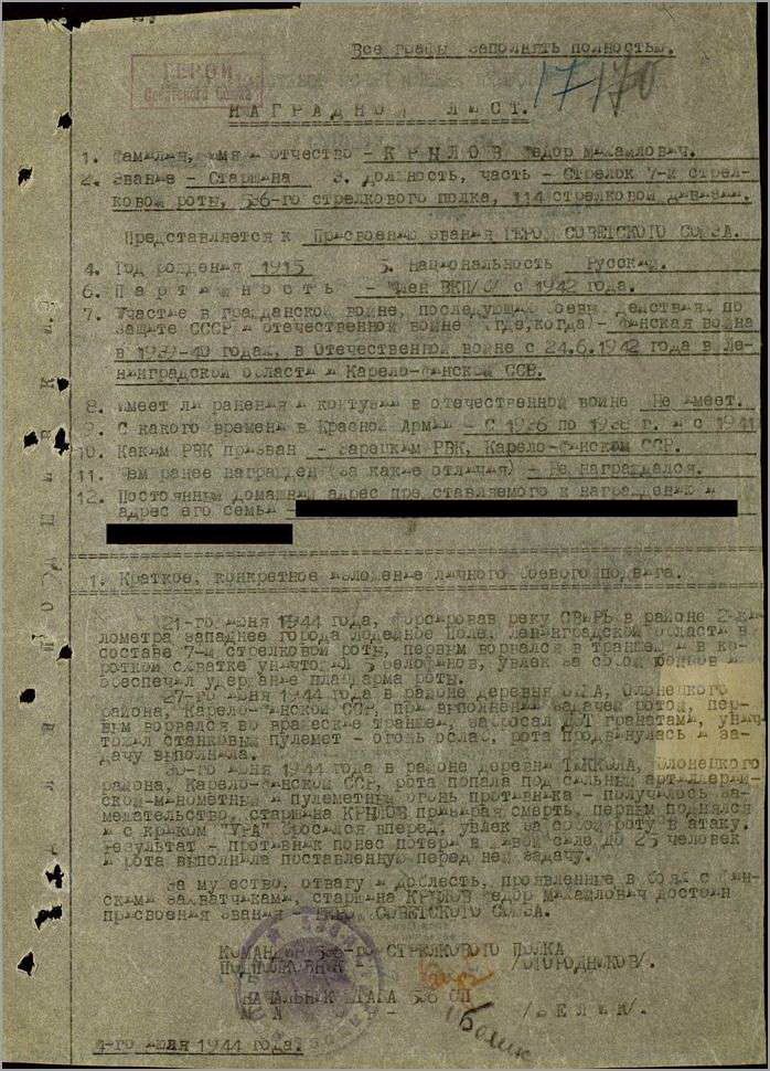 21 июля 1944 года Президиум Верховного Совета СССР принял Указ о присвоении Крылову Федору Михайловичу (1915-1977) звания Героя Советского Союза.