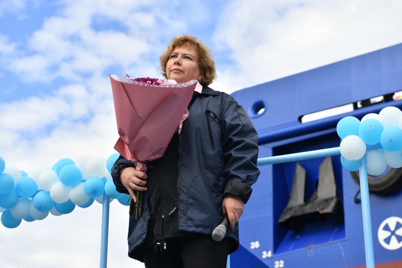 По флотской традиции бутылку шампанского о борт на удачу разбила «крестная мать» судна, которой была выбрана инженер планово-диспетчерского отдела Онежского судостроительно-судоремонтного завода Наталья Угарова.