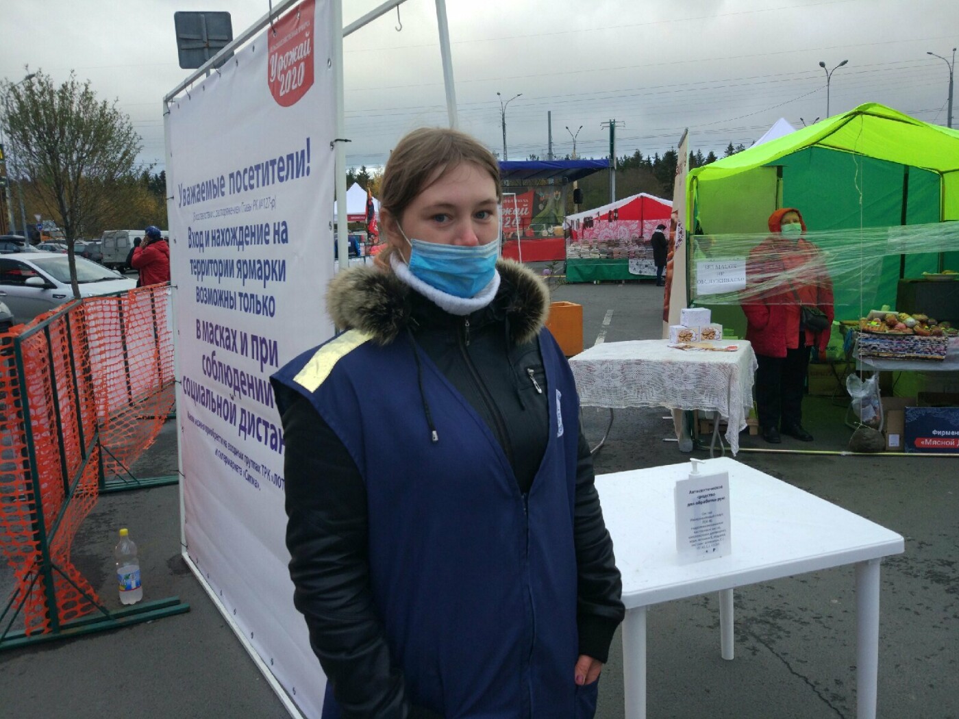 На самой ярмарке регулярно транслируют объявления о запрете прохода без маски, но что делать людям, которые уже пришли без нее. На специальных стойках стоят антисептики, а масок и перчаток нет. Почему бы не предусмотреть этот момент.
