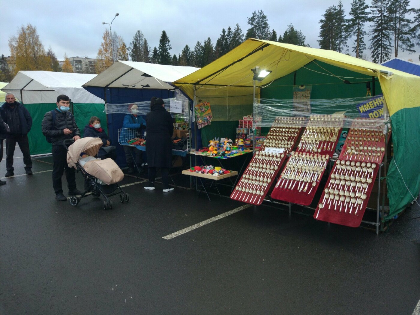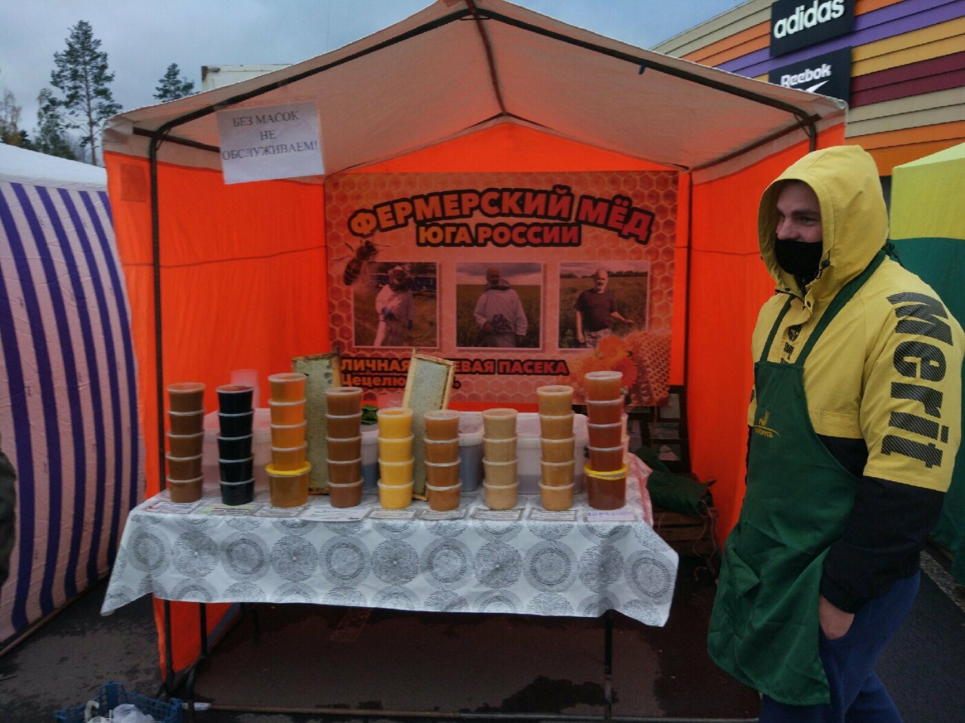 На вопрос, действительно ли не обслуживают без нее, торговцы отвечают, что так и есть. Приходится делать замечания, если кто-то снимает маску уже на территории ярмарки. Продавцы говорят, что до конфликта доходит нечасто, но неприятные случаи бывали. Особенно резко реагирует молодежь. За порядком на ярмарке, кстати, следят охранники. Все в масках.