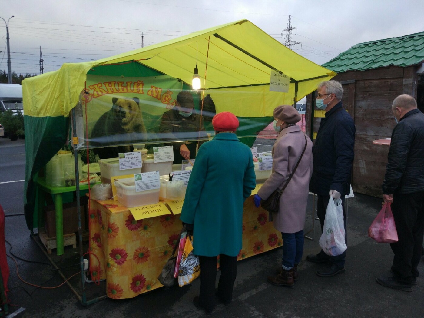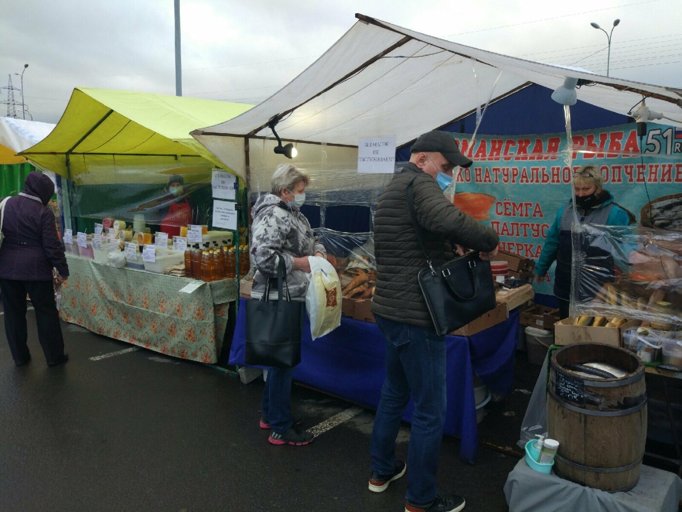 Если говорить о картине в целом, то определенные меры были предприняты и за их соблюдением следят. Палатки обтянули пленкой – это своеобразные защитные экраны, продавцы – все в средствах индивидуальной защиты, на многих торговых точках появились объявления о необходимости соблюдать дистанцию и носить маску.