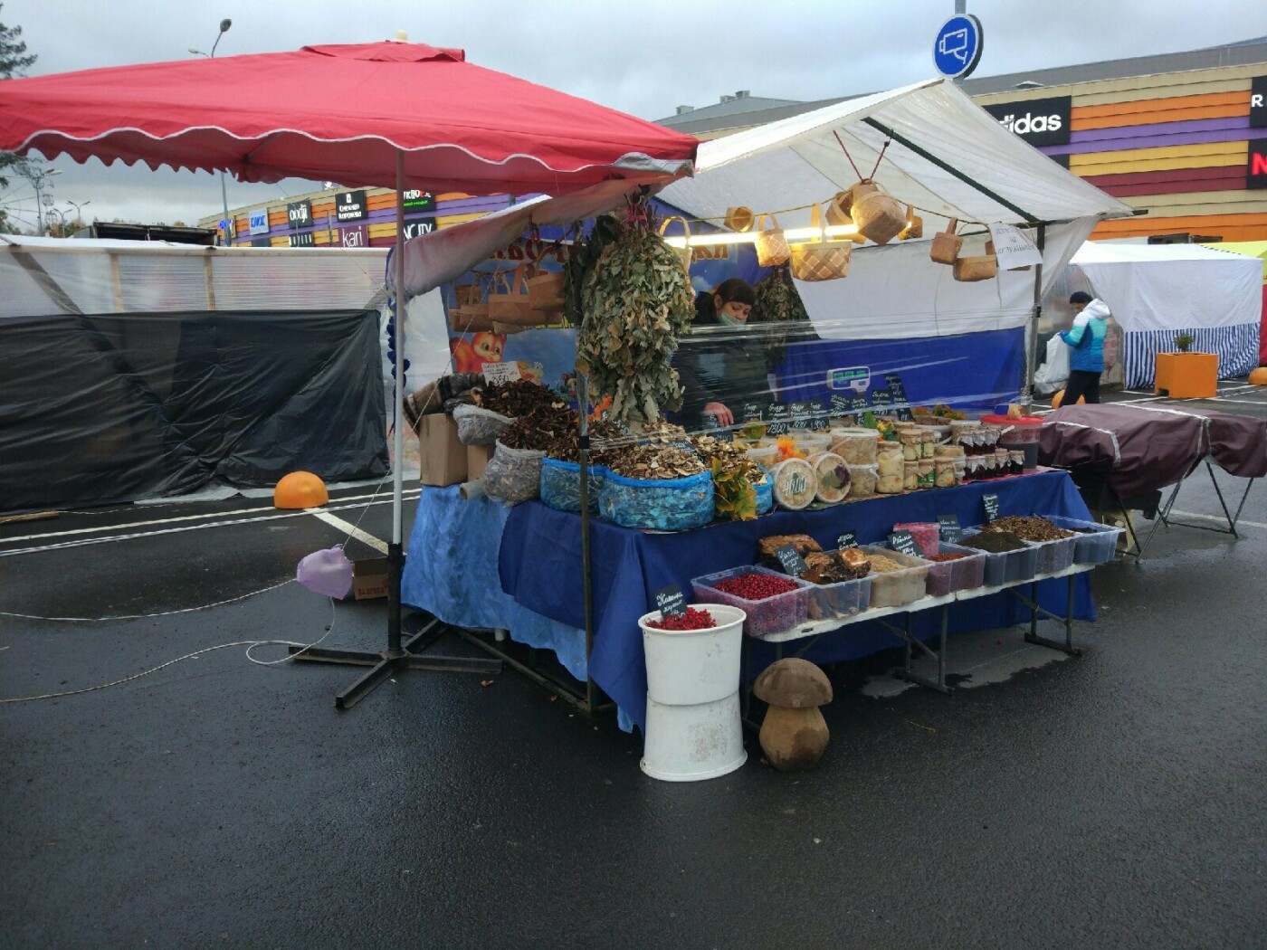 Дистанцию между палатками, вроде бы, тоже увеличили, благо места хватает. По крайней мере, павильоны не стоят вплотную друг к другу, так что с этим пунктом, можно сказать, все в порядке. Намного сложнее с выполнением оставшихся предписаний. Что касается участия продавцов из других регионов –они как торговали, так и торгуют. Пункт про допустимость продажи «изделий народных промыслов, но только местного производства» тоже остался без особого внимания. На ярмарке по-прежнему можно увидеть шубы, посуду, очки и прочие непродовольственные товары, сделанные явно не ремесленниками и не в Карелии.
