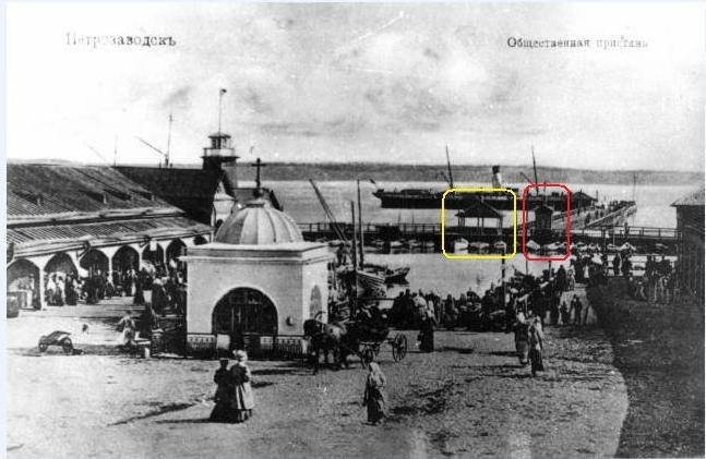 Фото: С. М. Прокудин-Горский, Общественная пристань на берегу Петрозаводского залива, справа- здание Петрозаводской спасательной станции, 1916