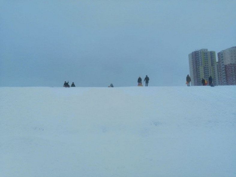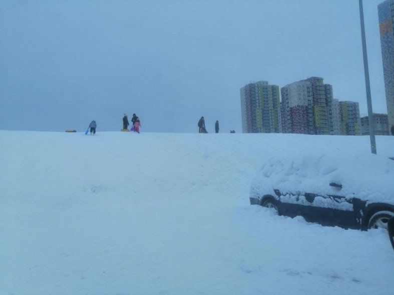 Ребята катались на санках и ватрушках под присмотром родителей – почему-то взрослые не видели большой опасности в том. что склон ведет прямо на парковку. Движение здесь не слишком оживленное, но тем не менее, машины ездят, причем в непосредственной близости от малышей.