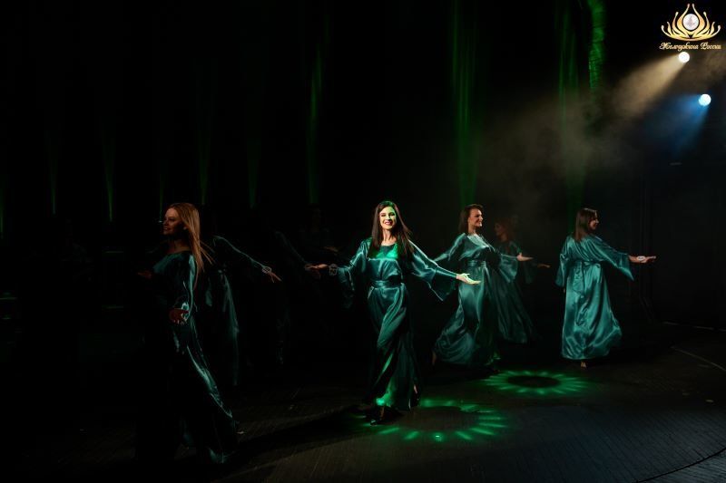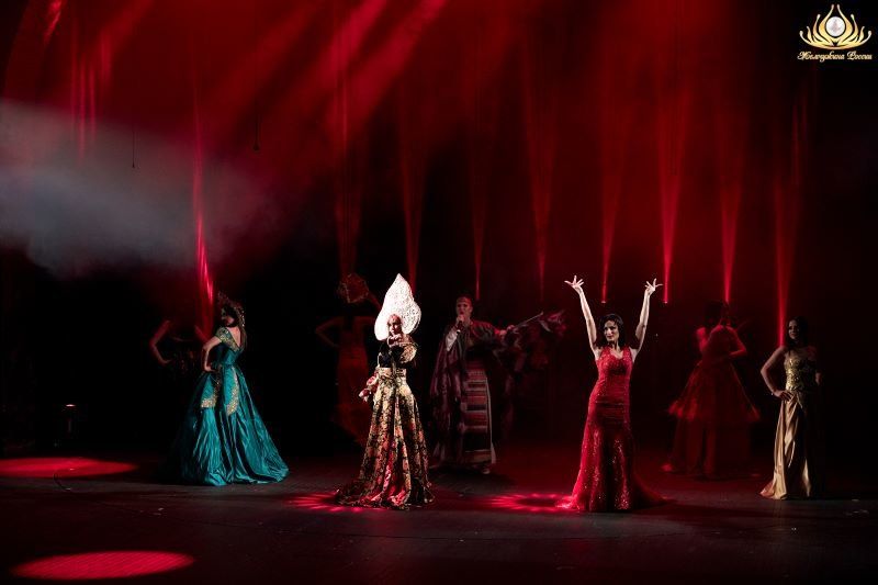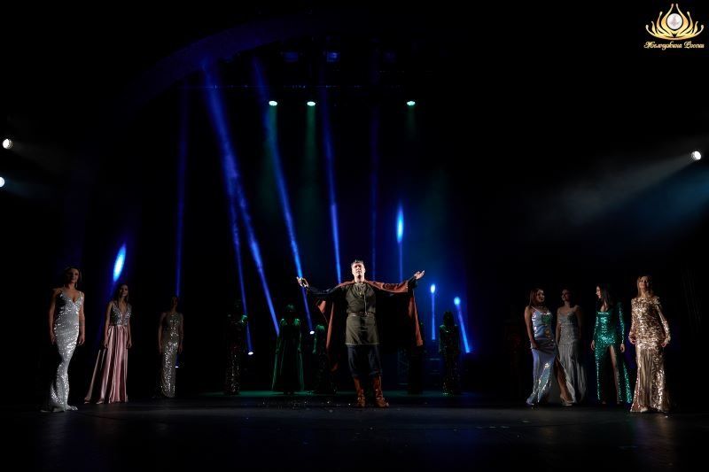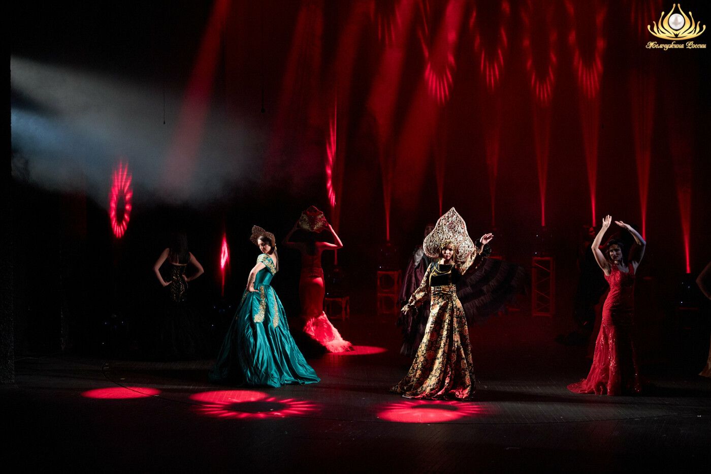 Первая композиция вечера «Интро» прошла в шикарных нарядах бренда Кристины Беловой сразу из трех коллекций: «Русские мотивы», «Жар-птица» и «Flora». Все платья выполнены в единственном экземпляре, с применением ручной вышивки в технике люневиль.