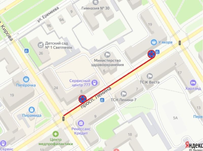 Полностью будет запрещена остановка по нечётной стороне проспекта Ленина от улицы Анохина до улицы Шотмана и по четной стороне вдоль дома №38 до площади Гагарина. На участке до улицы Шотмана остановка будет запрещена в ночное время (с 0:00 до 6:00).