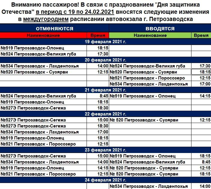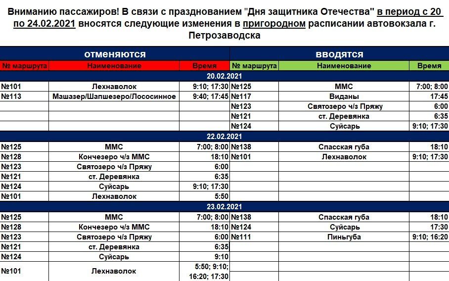 Из-за «Дня защитника отечества» изменится расписание пригородных и междугородних автобусов с отправлением из карельской столицы. Об этом сообщил официальный паблик автовокзала.