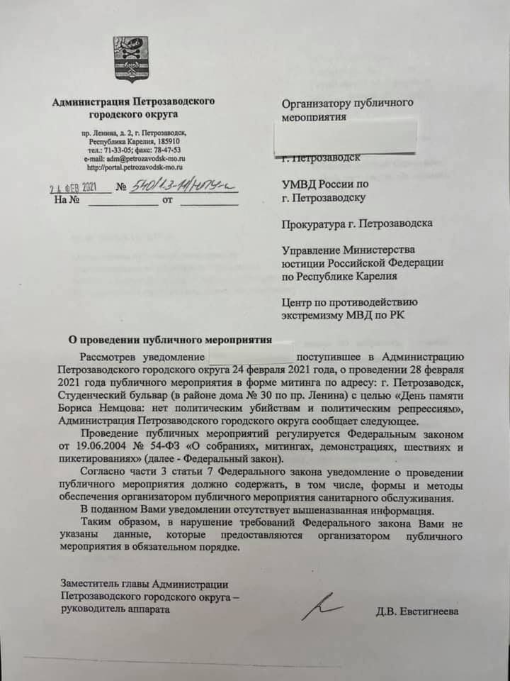 Отметим, что со стороны мэрии абсурдные отказы, нарушающие не только Конституцию, законы, но и здравый смысл, подписывает заместитель главы администрации Диана Евстигнеева. Мы полагаем, что такие вот насмешки мэрии – отличный ответ тем, кто наивно полагает, что власть может согласовать протестный митинг.