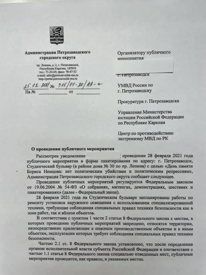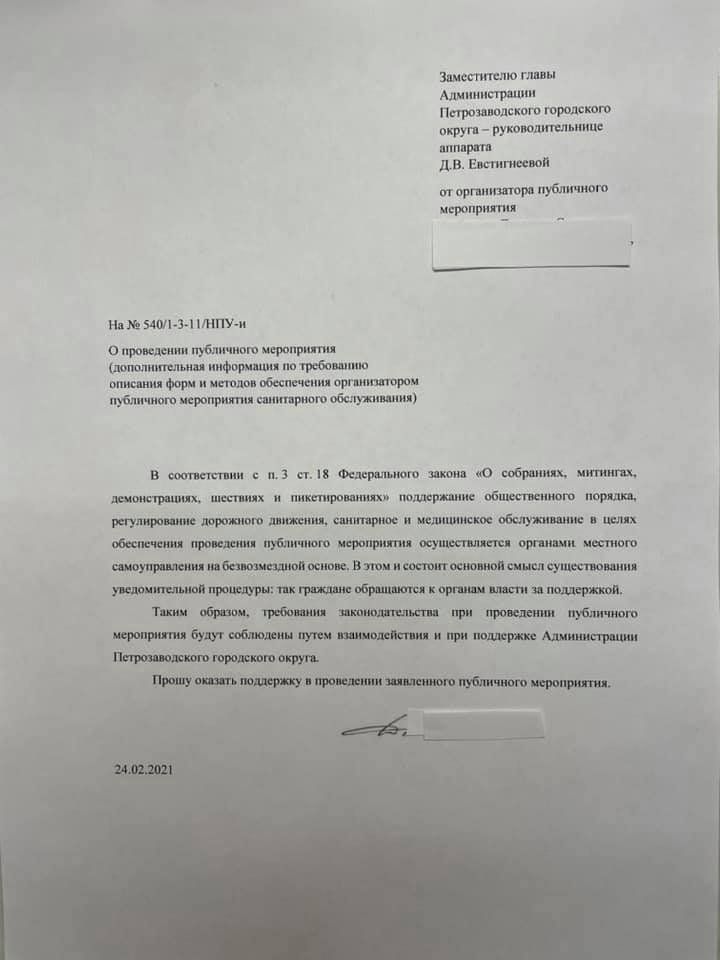 В качестве причины названо не что иное как нарушение сроков. Хотя день подачи задокументирован на фото, опубликованном на моей странице ВК, — рассказывает Слабунова. – Получив отказ, мы подали уведомление о проведении 28 февраля пикета численностью до 300 человек на Студенческом бульваре Петрозаводска. Мэрия предъявила претензии, что в уведомлении не содержатся формы и методы обеспечения санитарного обслуживания! На наши контрдоводы, что в соответствии с законодательством поддержание общественного порядка, регулирование дорожного движения, санитарное и медицинское обслуживание при проведении публичного мероприятия осуществляется органами местного самоуправления, мэрия ответила срочными работами «по ремонту установок наружного освещения с использованием специализированной техники, требующими соблюдения специальных правил техники безопасности как в зоне работ, так и вблизи объектов».