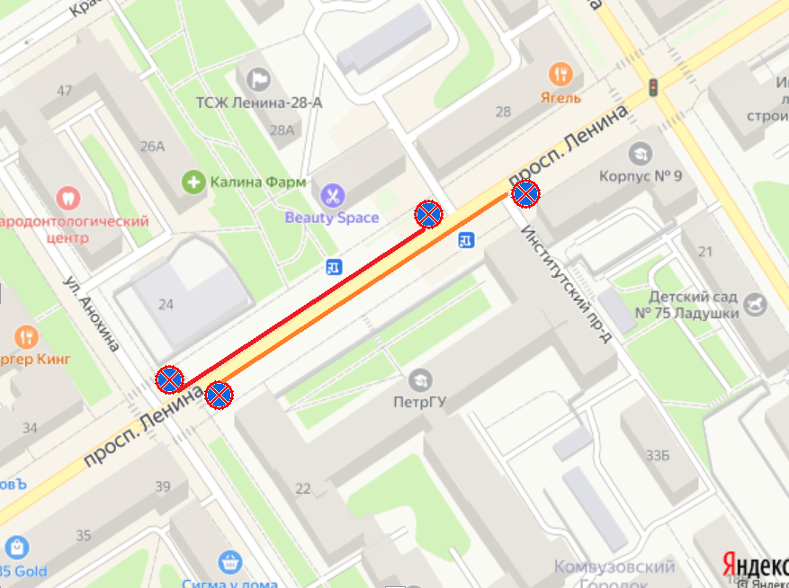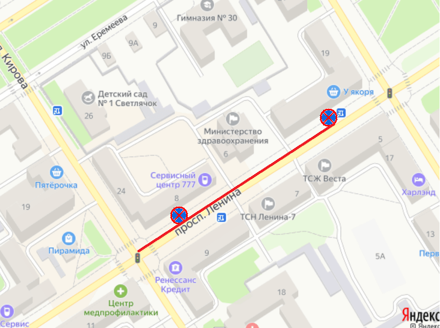 В ночное время (с 0.00 до 6.00) запрещена остановка на проспекте Ленина по чётной стороне от улицы Герцена до заездного кармана, по нечётной – до дома № 31, а также по нечётной стороне проспекта Ленина от Институтского проезда до улицы Анохина. Постоянно ограничения будут действовать по нечётной стороне от здания № 31 до улицы Антикайнена и по чётной стороне от улицы Анохина до дома № 28.