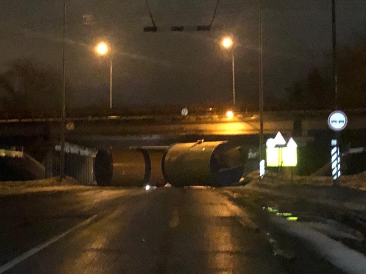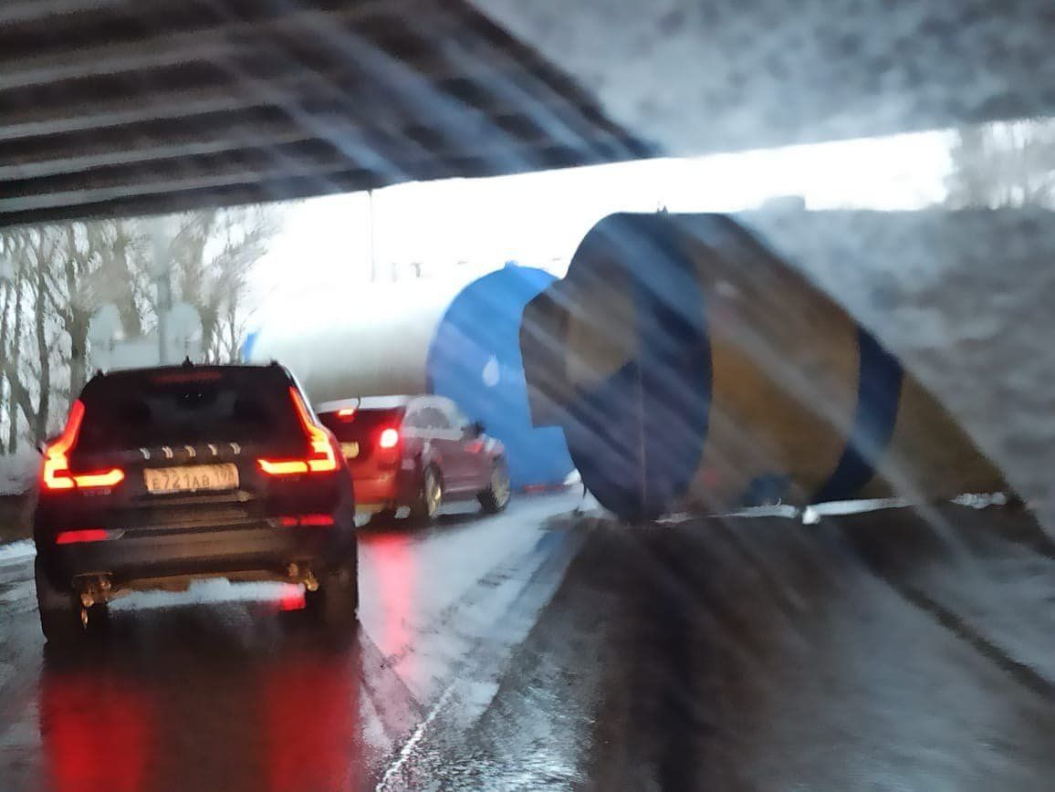 Упавшая на дорогу цистерна перегородила большую часть дороги, что значительно осложнило движение на оживленном участке трассы. На месте организовали реверсивное движение по одной полосе. Утром здесь работали сотрудники ГИБДД и спецтехника. В ближайшее время дорогу освободят.