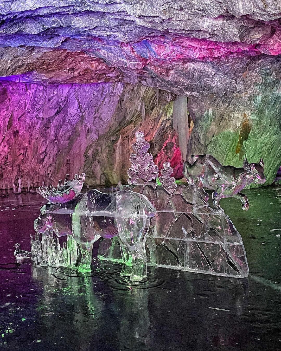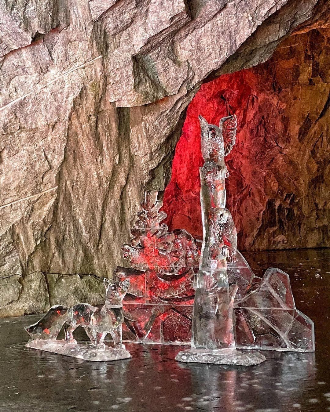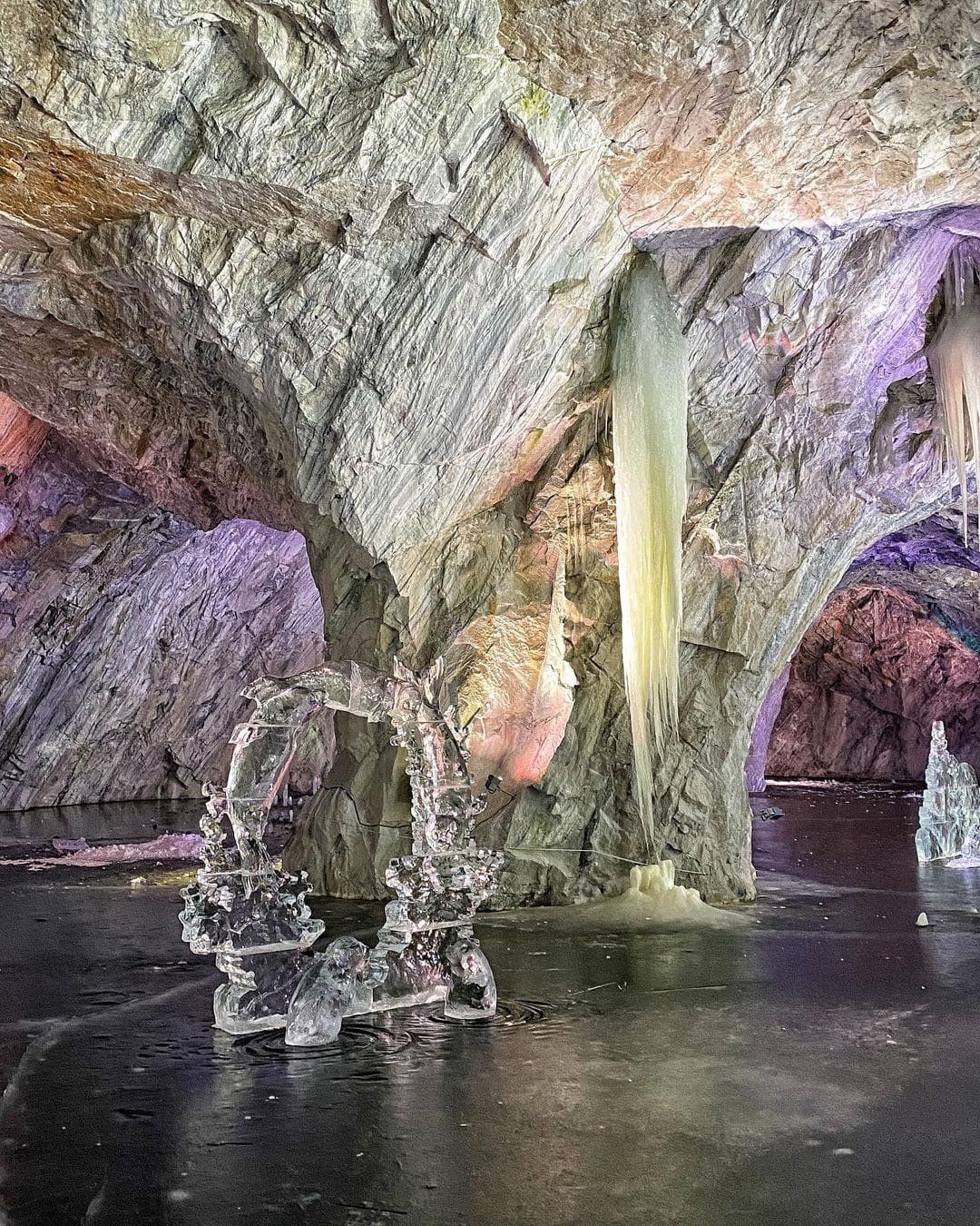 В Сети появились снимки ледовых скульптур в рускеальских пещерах. Фото опубликовал официальный паблик горного парка.