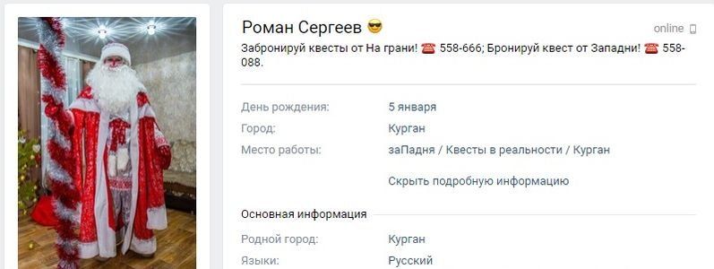Курган – это Западная Сибирь, Уральский федеральный округ и 2000 км от Петрозаводска, если лететь прямиком на ковре-самолете. В соцсети ВКонтакте мы нашли только одного Романа Сергеева, который живет в городе Курган и при этом подписан на группу Петрозаводск Live. Кроме того, выяснилось, что этот самый Роман Сергеев подписан еще на несколько аналогичных групп из других регионов. У всех таких групп одинаковый слоган: «Только тщательно отобранные новости, фото, факты, события и наблюдения из жизни… и далее указан регион». Вот фотография этого человека. Его аккаунт открыт. Видно, что он занимается квестами, а также трудится Дедом Морозом.
