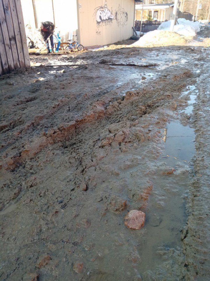 После оттепели костомукшский двор, в котором зимой велись земляные работы, стал непроходим. Местные жители рассказали: просто выйти из дома – уже проблема, машины с трудом могут проехать по дороге, которая больше подходит для проведения гонок по бездорожью.
