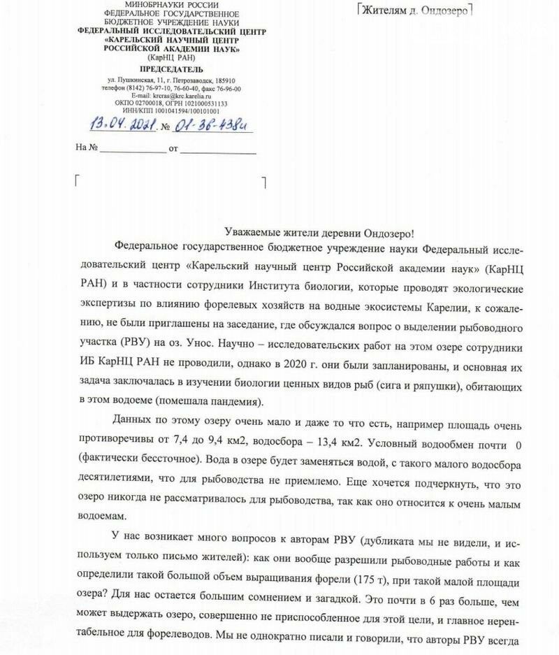 В распоряжении портала «Карелия.Ньюс» попал свежий ответ жителям деревни Ондозеро от Карельского научного центра РАН. Письмо подписано председателем центра, доктором биологических наук Ольгой Бахмет. Письмо карельских ученых характеризует Унусозеро и полностью опровергает позицию федеральных ученых, которых местные жители назвали «карманной наукой».