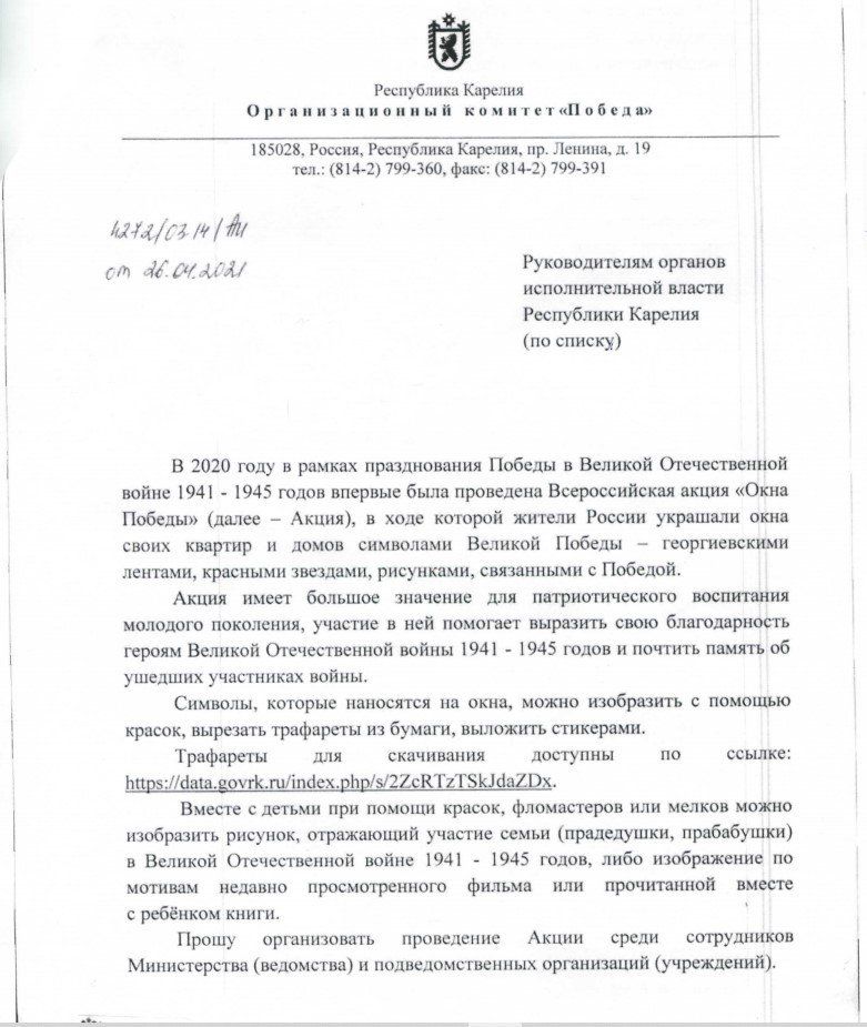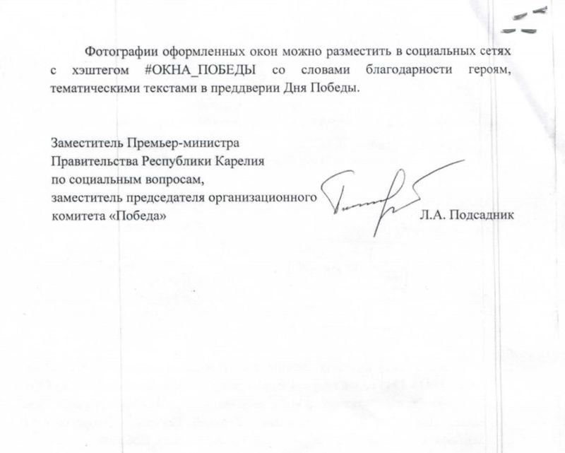 Патриотизм и память о Великой Отечественной войне у нас теперь идет не только от сердца, но и по распоряжению начальства. Скан письма руководителям органов исполнительной власти Карелии за подписью заместителя премьер-министра правительства Ларисы Подсадник оказался в распоряжении портала «Карелия.Ньюс».