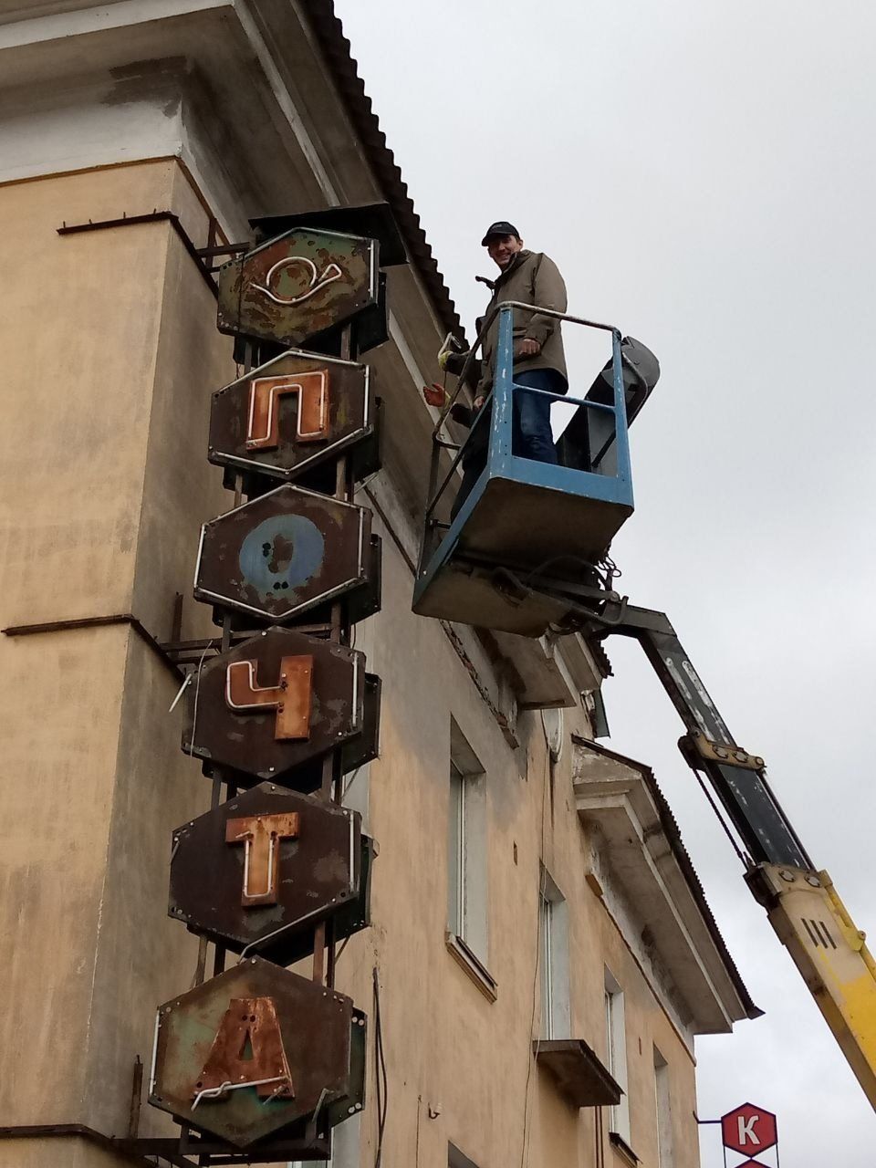В целом с металлом всё в порядке. Как снимать вывеску мы уже продумали — понадобится аж три машины (кран, автовышка и «микроб» для погрузки). &a;lt;…&a;gt; Лампы хотим восстановить газонаполненные, какие висят и сейчас. У них есть ряд преимуществ, помимо аутентичности, а именно их долговечность.