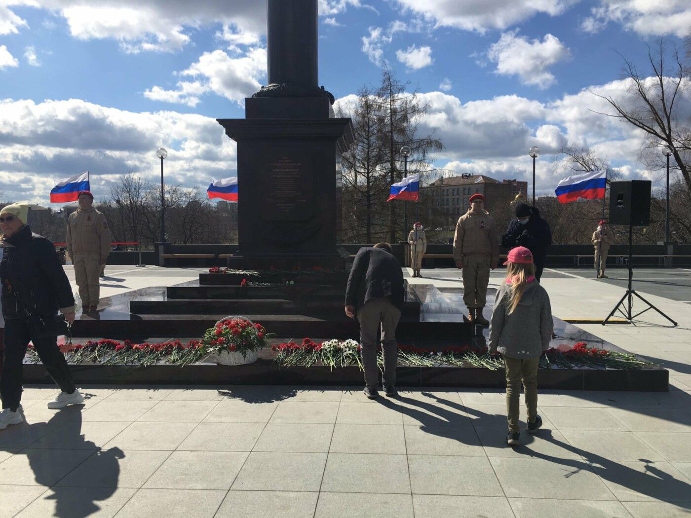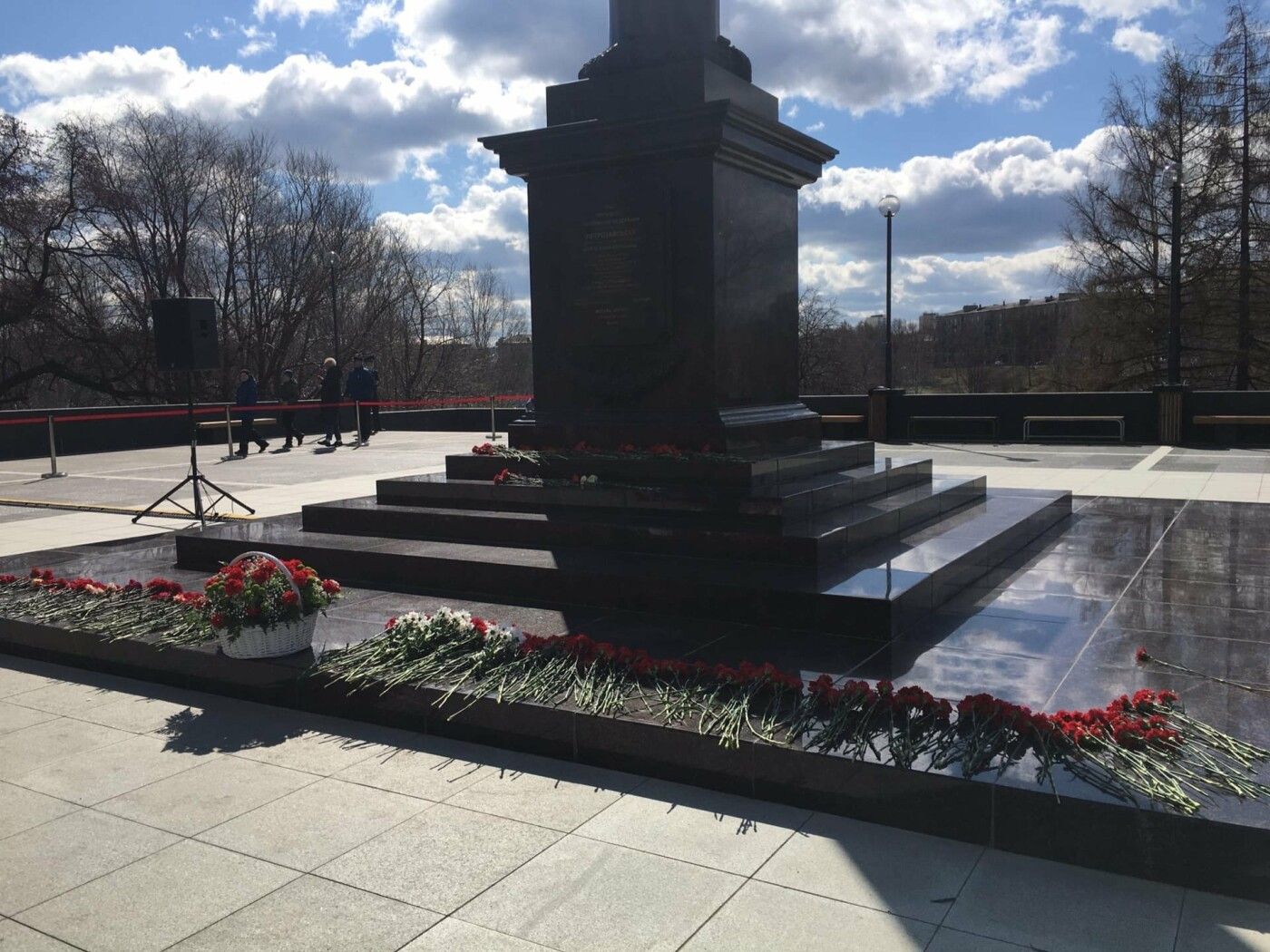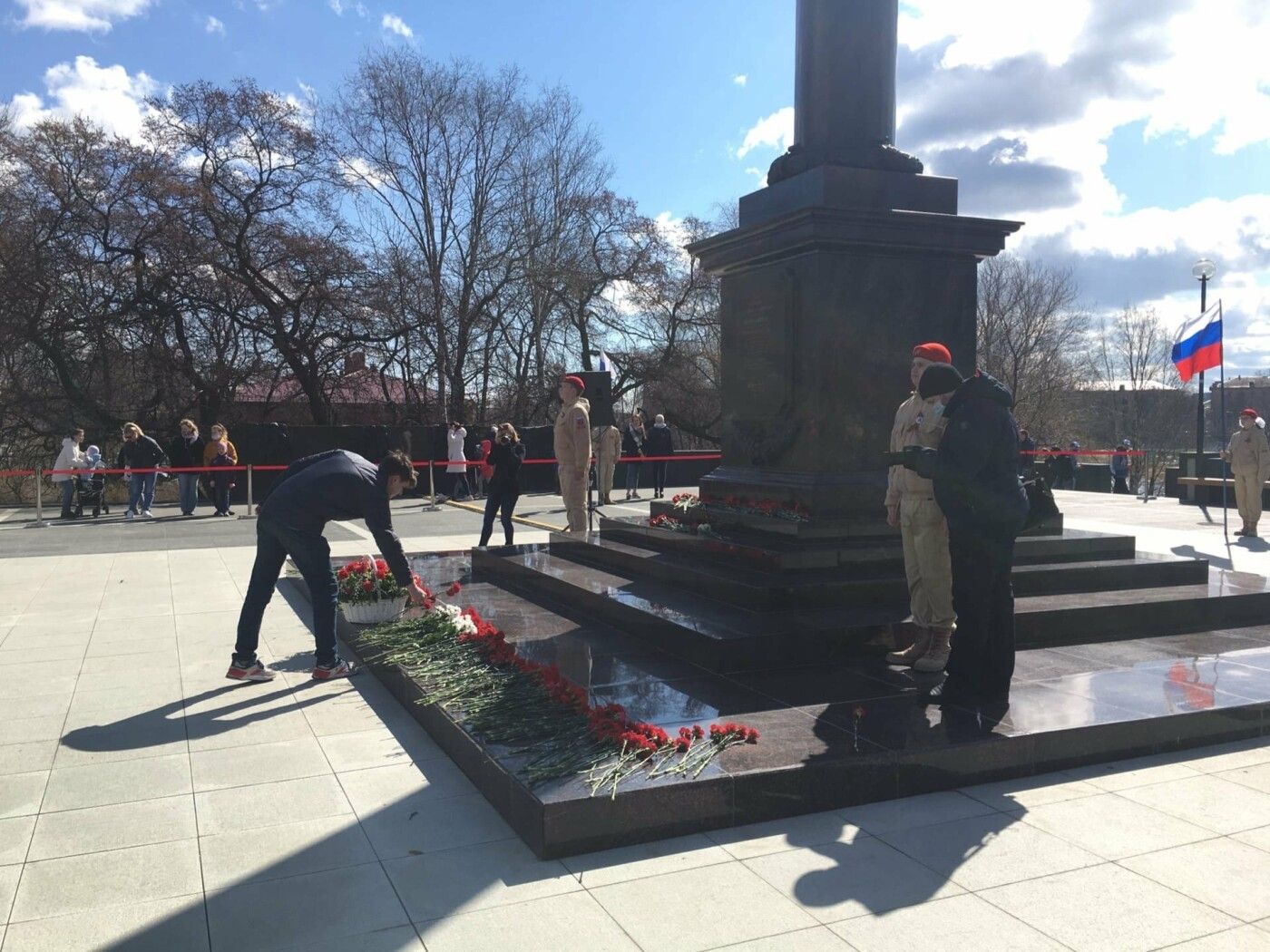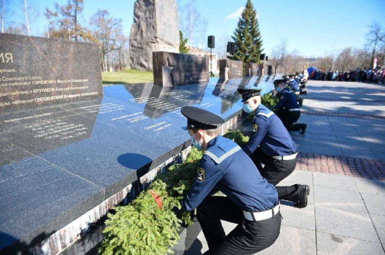 В 9:00 началась церемония возложения цветов и венков к мемориальным комплексам «Аллея Памяти и Славы» и «Могила Неизвестного солдата с Вечным огнем Славы», она продолжилась у стелы «Город воинской Славы».