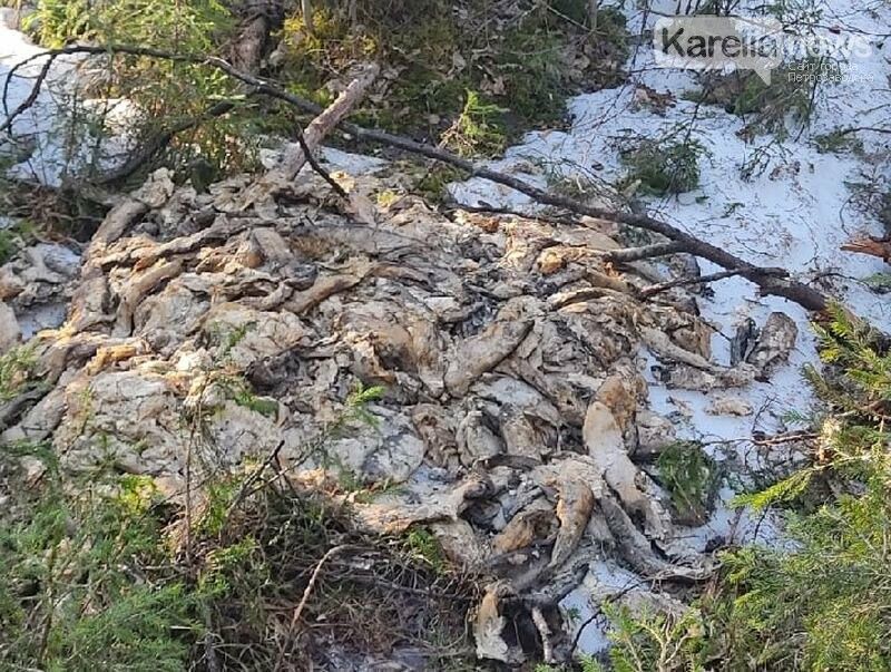 Жители Калевальского района обнаружили уже вторую свалку мертвой форели. Она находится всего в 100-150 метрах от трассы «Кемь-Калевала». Тушки форели выброшены рядом с охотничьим лабазом для охоты на медведя. С другой стороны лабаза стоит бочка с тушкой тюленя, которые очевидно был привезен сюда с Белого моря. Охота на тюленей запрещена, так и что здесь нарушение закона.