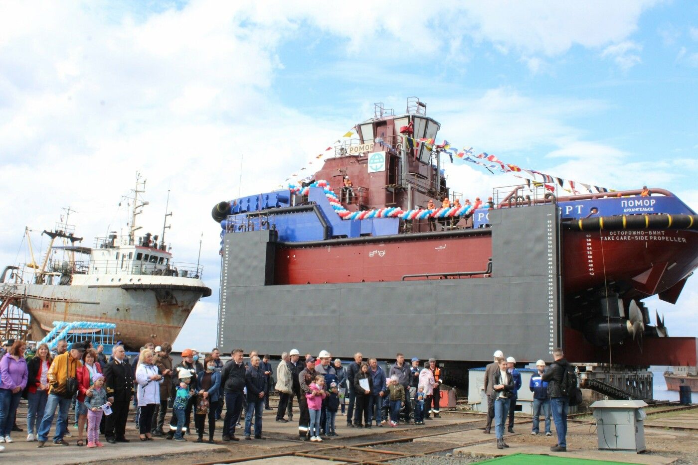 14 мая на Онежском судостроительно-судоремонтном заводе прошла торжественная церемония спуска на воду азимутального буксира «Помор».
