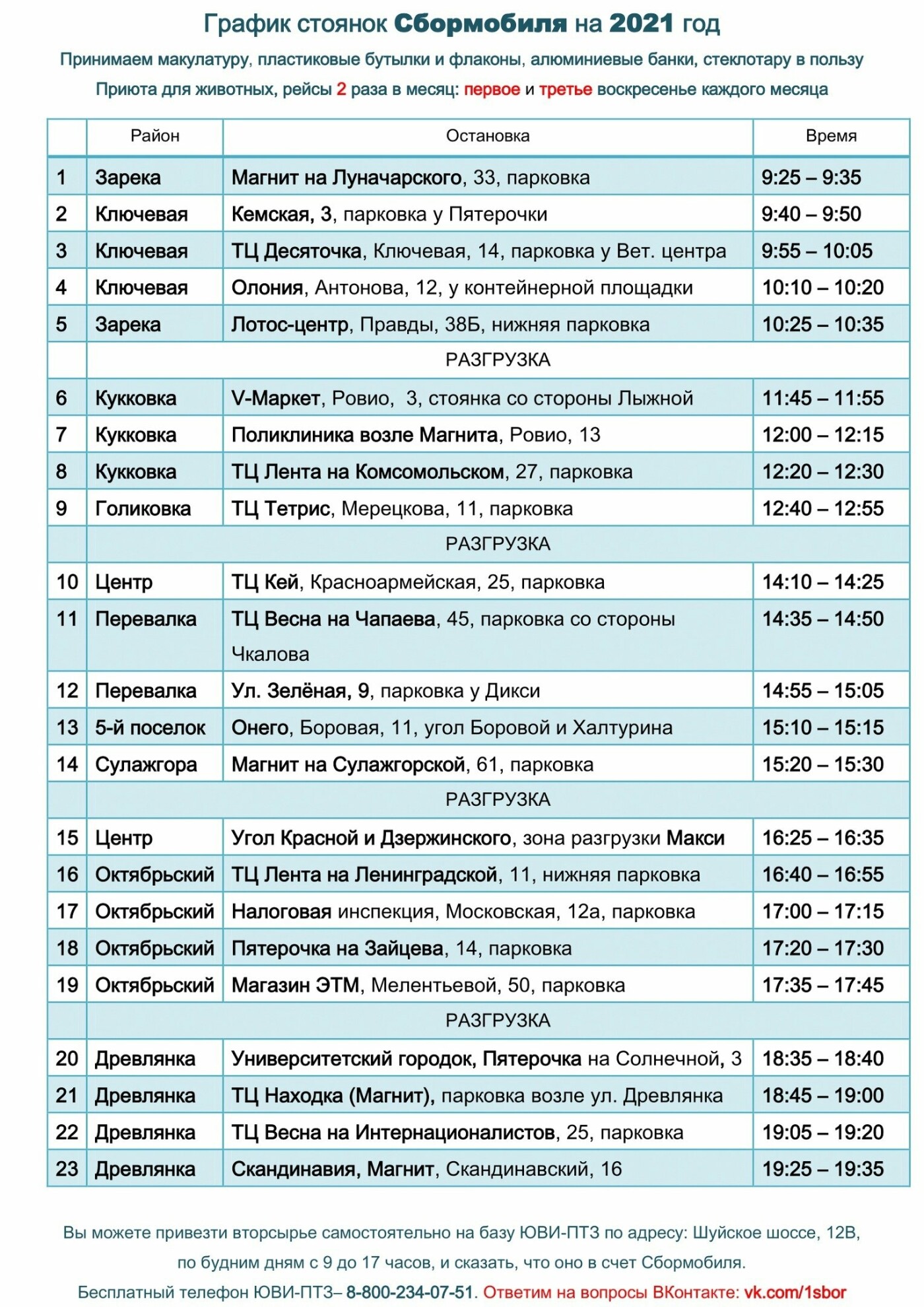 Волонтёры примут у петрозаводчан на переработку макулатуру, стеклотару, определенные виды пластика, алюминий и так далее. В расписании — 23 остановки в разных районах города. График стоянок смотрите на фото ниже.