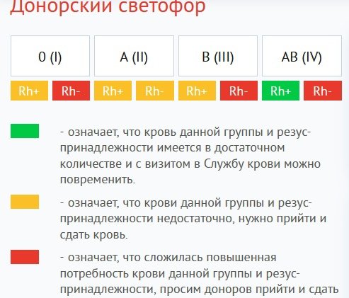 — Для создания оптимального запаса донорской крови создан донорский светофор. Следите за его обновлением перед визитом в учреждение Службы крови — это сбережёт ваше время и поможет учреждению оперативнее работать. Станция нуждается в донорах отрицательных резусов всех групп, — говорится в сообщении.