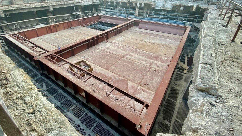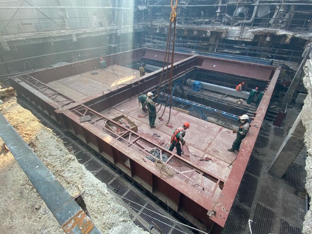 Высота нового электрофильтра в собранном виде достигает уровня шестиэтажного жилого дома. Старое оборудование демонтировано. Сейчас команда проекта проводит работы по установке сухого золоудаления в проектное положение. Начался монтаж опорного пояса электрофильтра. Одновременно ведется монтаж линзовых заслонок и дна бункера фильтра.