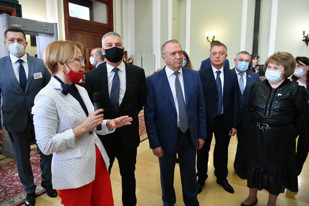 Артур Парфенчиков и Сергей Катырин осмотрели выставки, работающие сейчас в Торгово-промышленной палате. Выставка «Северная звезда», выполненная в традиционных карельских цветах, рассказывает о крупных предприятиях лесопромышленного и горнопромышленного комплексов, о судостроительных и машиностроительных предприятиях, предприятиях рыбной и пищевой промышленности, основных туристических доминантах Карелии, значимых исторических вехах региона.