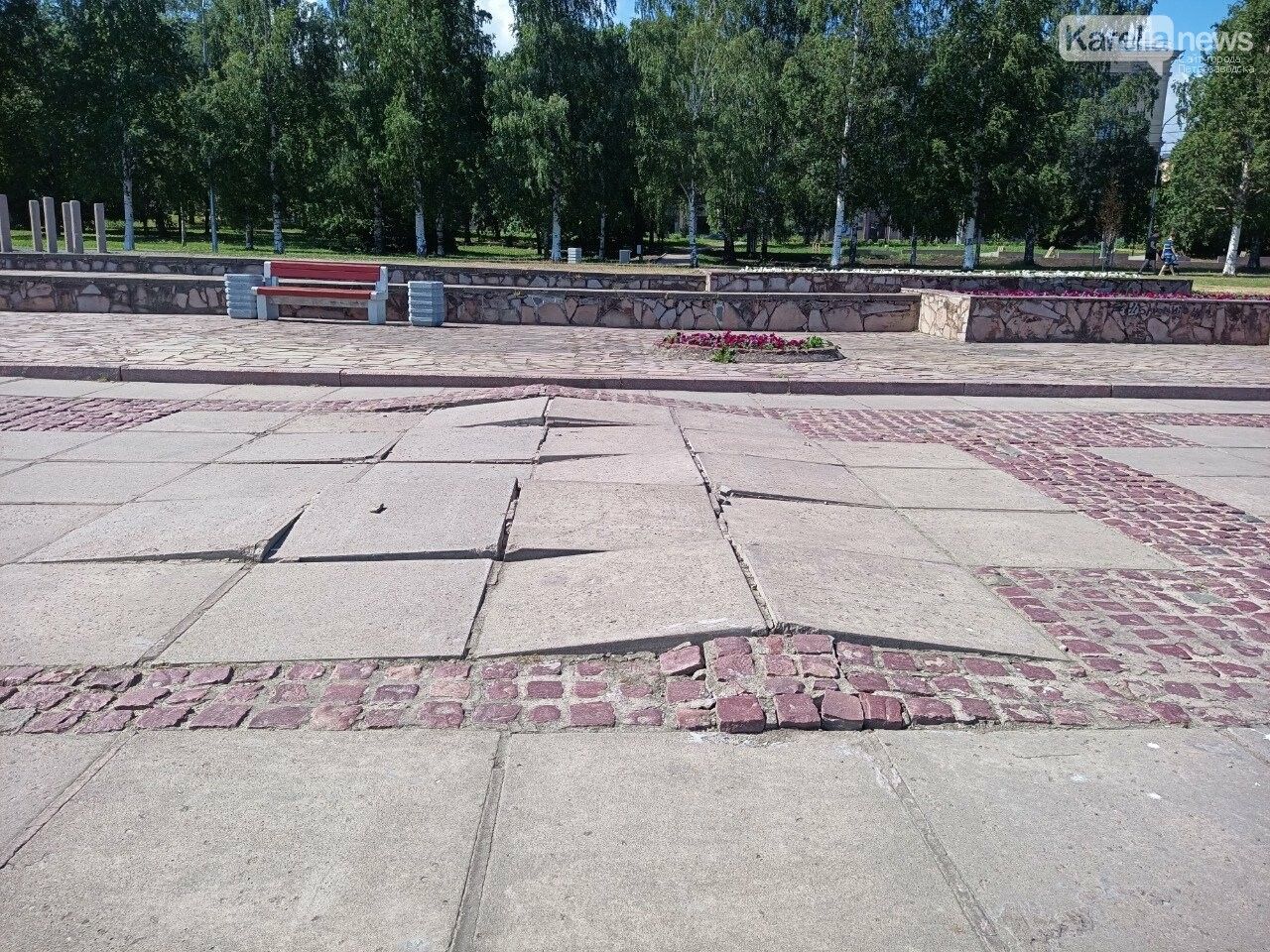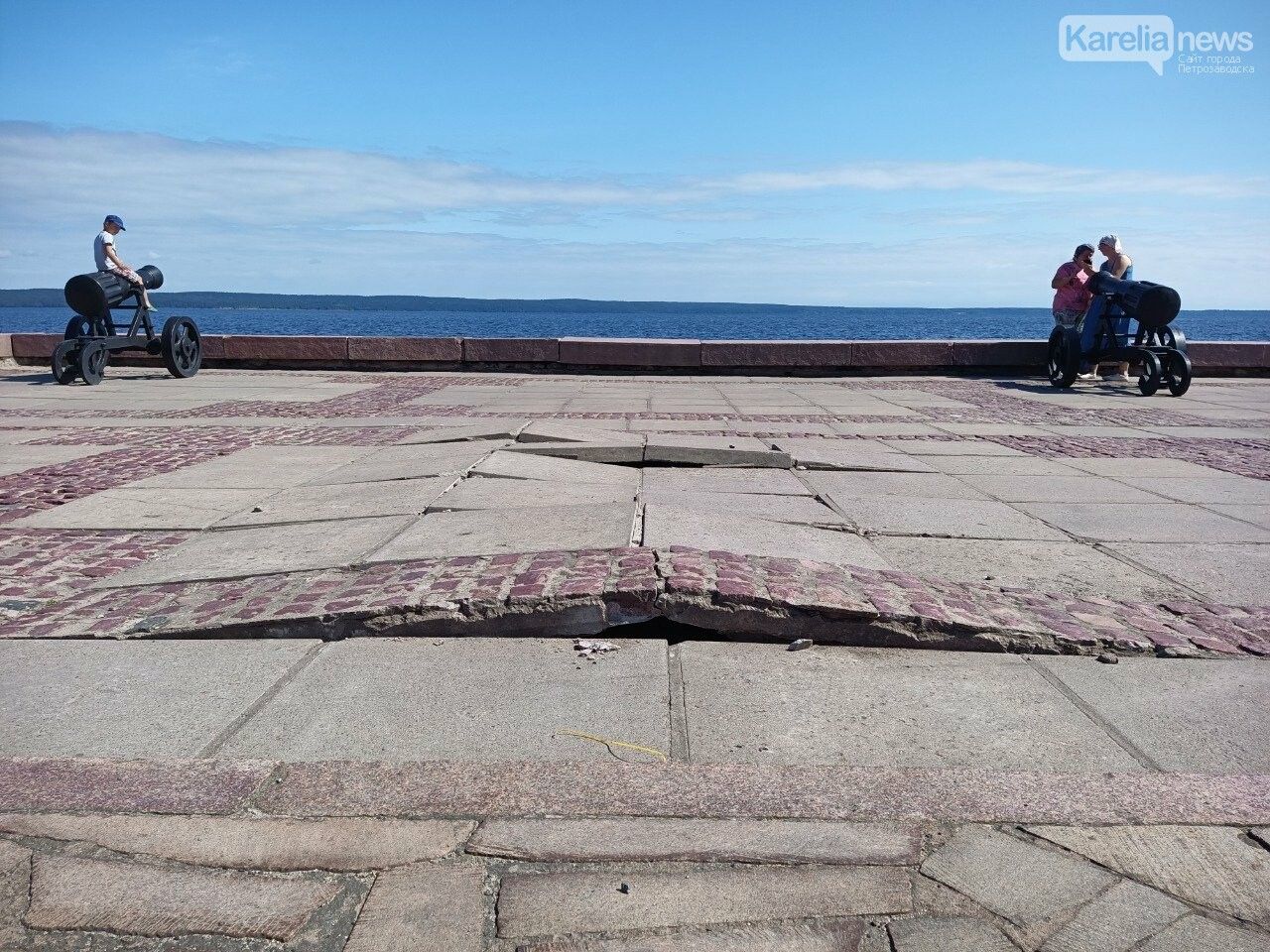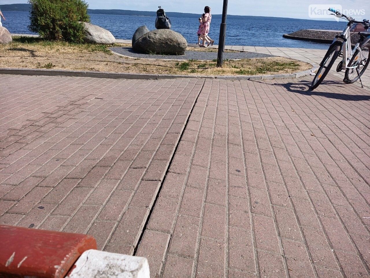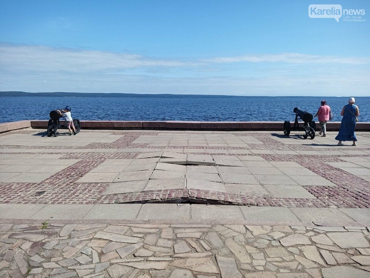 Недавно градоначальник Владимир Любарский во время пробежки по набережной сфотографировал сфотографировал ямы, лужи и мусор. Теперь петрозаводчане делятся в соцсетях снимками с новыми проблемами и обмениваются догадками – что случилось. Бетонные плиты с малиновым кварцитом и недавно уложенная брусчатка вздулись – теперь с волнами Онеги соседствуют волны дорожного покрытия.