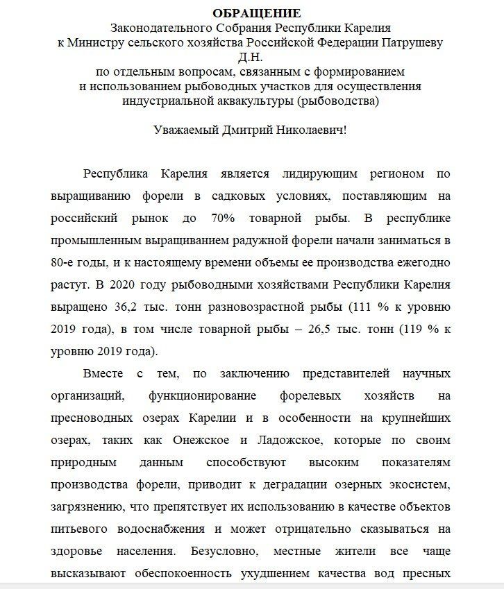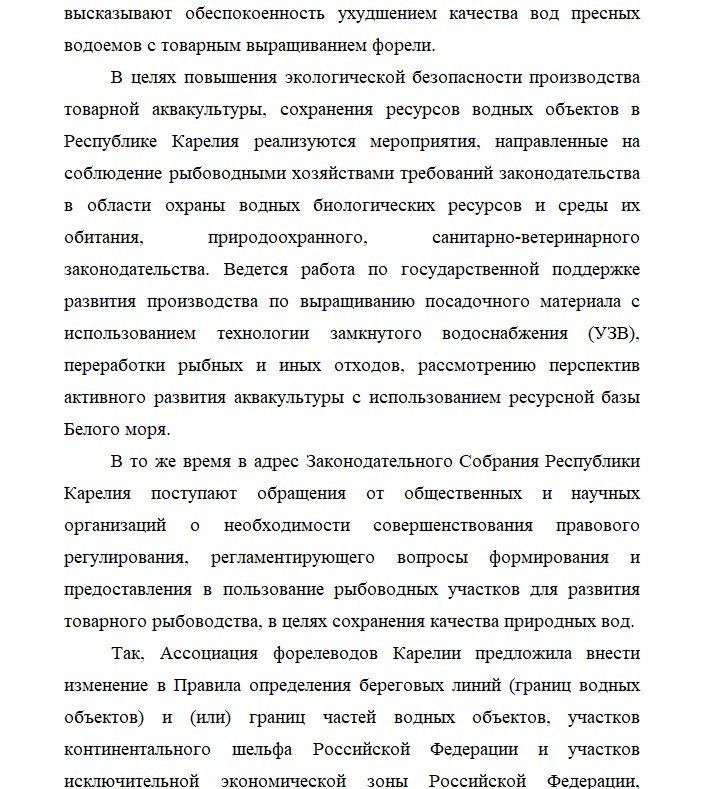 В распоряжении портала «Карелия.Ньюс» оказался этот документ. Так, народные избранники выражают серьезную обеспокоенность тем фактом, что развитие форелеводства «приводит к деградации озерных экосистем, загрязнению, что препятствует их использованию в качестве объектов питьевого водоснабжения и может отрицательно сказываться на здоровье населения».