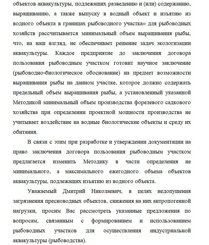 Второе важное изменение касается производственных мощностей форелевых хозяйств. Очень важно выращивать столько форели, сколько может выдержать водоем и его экология. У нас же зачастую выращивают больше, что приводит к быстрому загрязнению водоемов. И законы здесь против экологии. Сейчас по существующей методике для рыбоводных хозяйств рассчитывается минимальный объем выращивания рыбы. По мнению депутатов, необходимо изменить методику в части определения не минимального, а максимального ежегодного объема объектов аквакультуры, подлежащих изъятию из водного объекта.