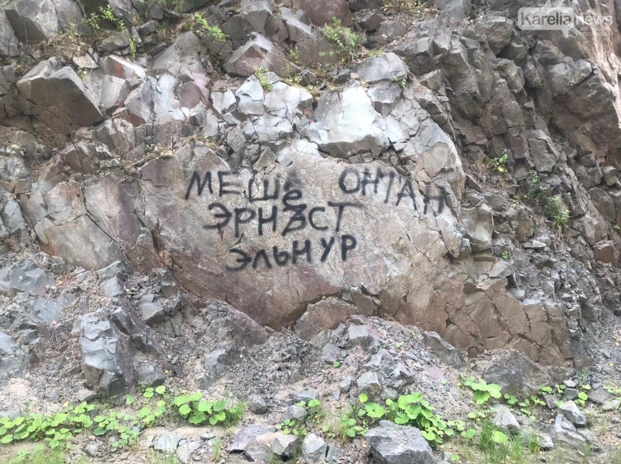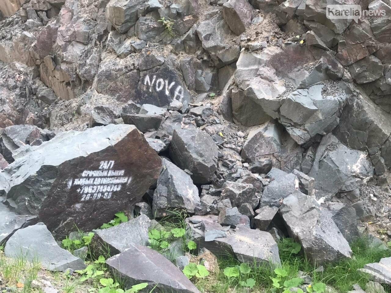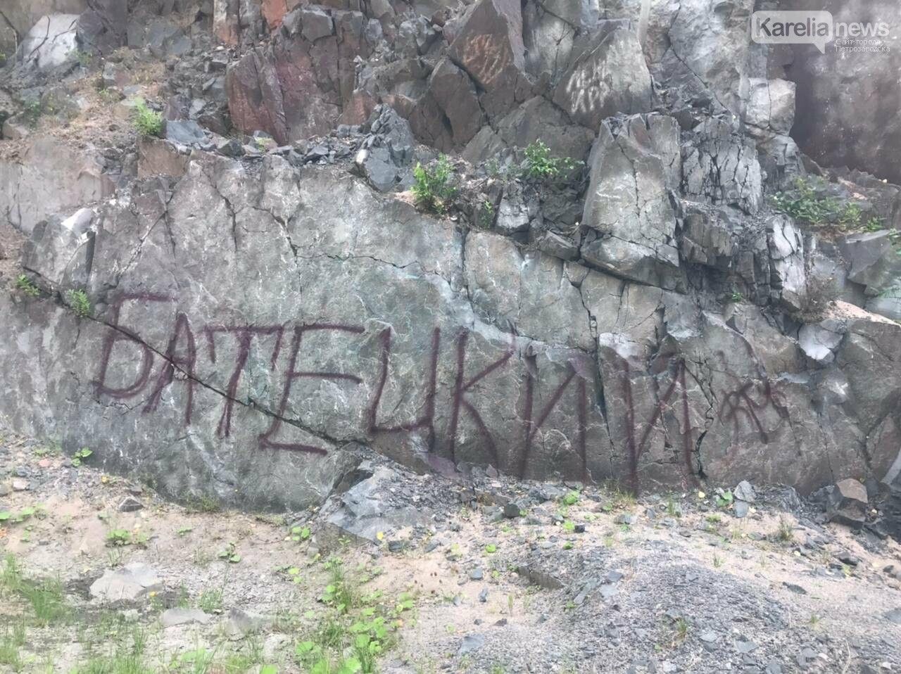 Иными словами, скалы снова изуродованы. На этот раз много авторов из Карелии. Впрочем, есть и приезжие из Питера, других городов и даже с Украины. Многие не побоялись оставить свои фамилии, а кто-то рискнул разместить рекламу выкупа любых автомобилей с телефоном. В общем, это не улики, а прямо-таки обратная связь.