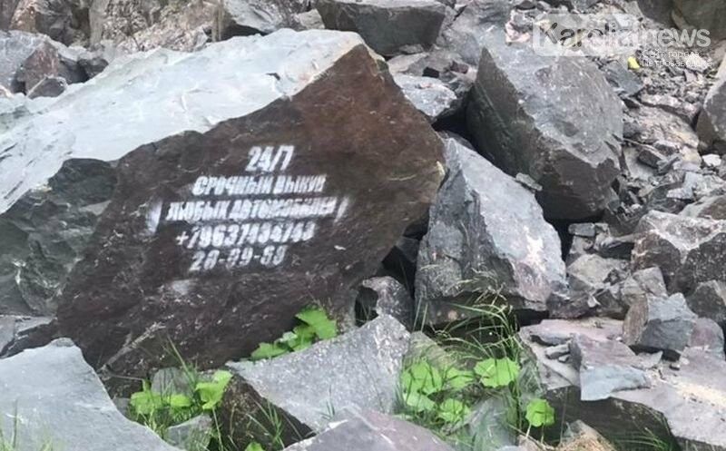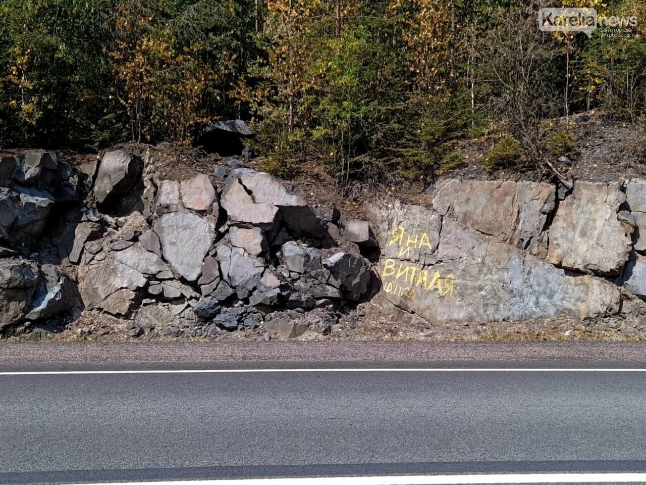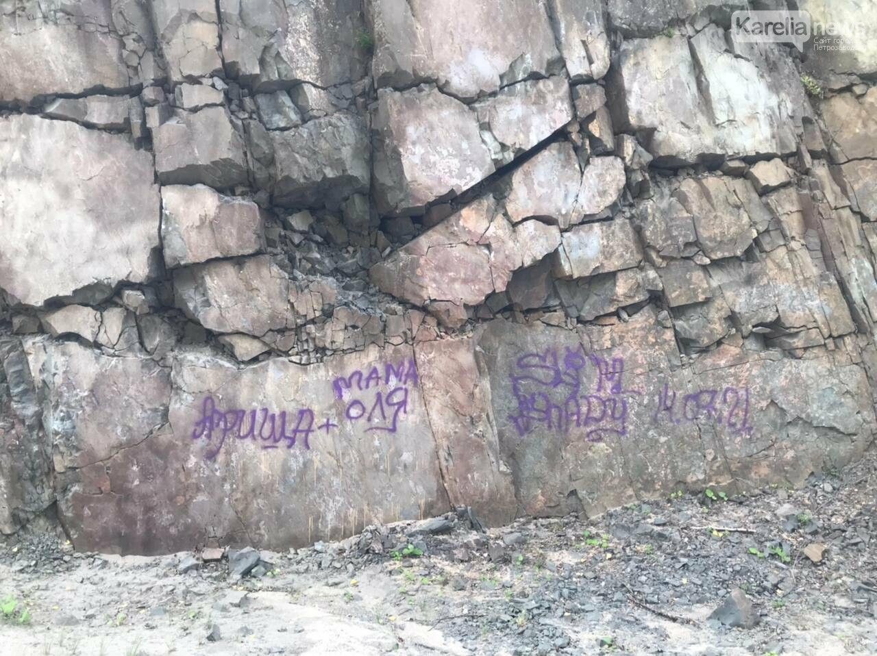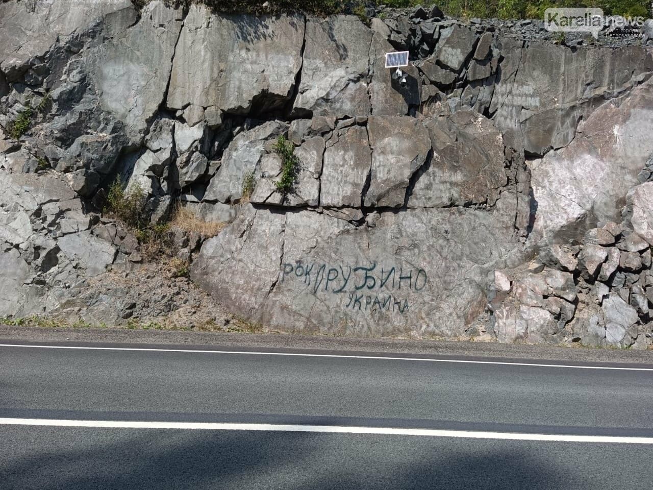 Иными словами, скалы снова изуродованы. На этот раз много авторов из Карелии. Впрочем, есть и приезжие из Питера, других городов и даже с Украины. Многие не побоялись оставить свои фамилии, а кто-то рискнул разместить рекламу выкупа любых автомобилей с телефоном. В общем, это не улики, а прямо-таки обратная связь.